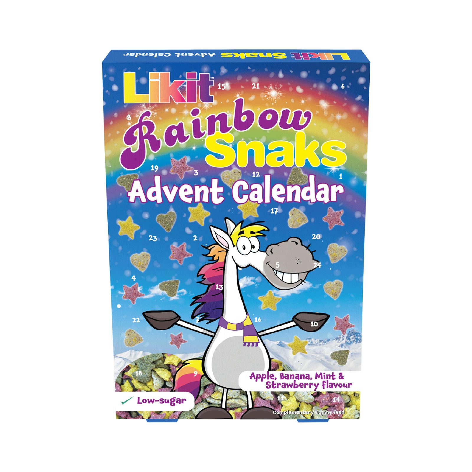 Adventní kalendář Rainbow Likit Snaks ukrývá za každými dvířky hrstku nízkosacharidových pamlsků, které potěší každého koňského mlsouna. Váš kůň si tak může každý den v prosinci pochutnat na oblíbených příchutích jablko, máta, jahoda a banán.