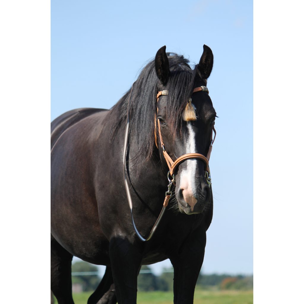 Precizně zpracovaná bezudidlová uzdečka Shango je takzvaná "side pull bezudidlová uzdečka". Je vyrobena z kvalitní kůže v přírodním vzhledu. Čelenku zdobí střapec, nánosník je měkce podložený. Protiskluzové otěže se rychle a snadno připínají pomocí karabinek přímo na očka integrovaná v nánosníku.