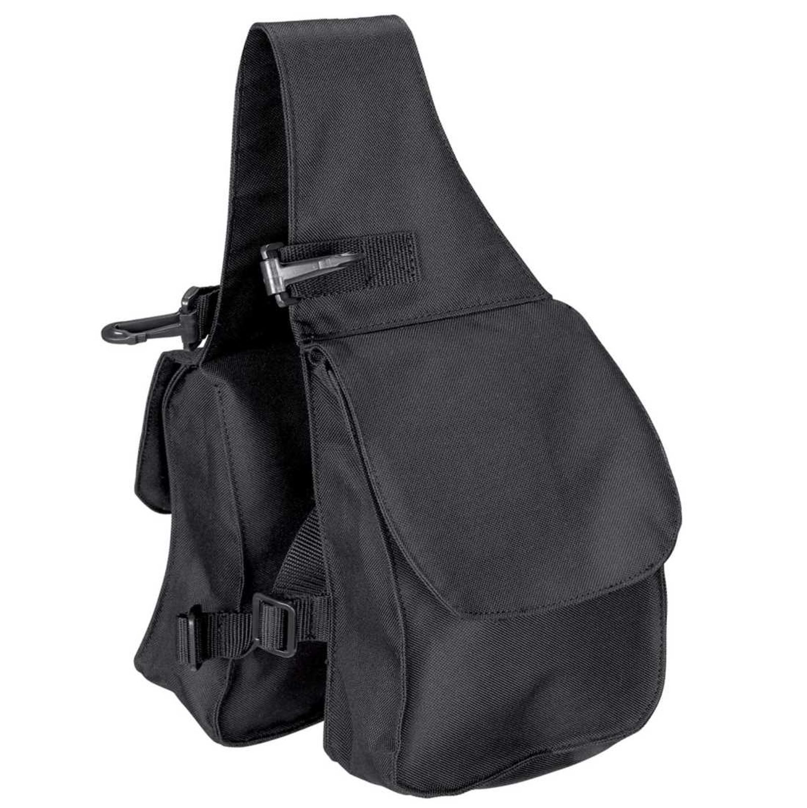 Menší brašny z pevného nylonu, k připnutí k sedlu pomocí plastových karabinek a popruhů. Ideální na delší tůry v sedle. Velikost 22cmx15cmx8cm. Barva: černá.