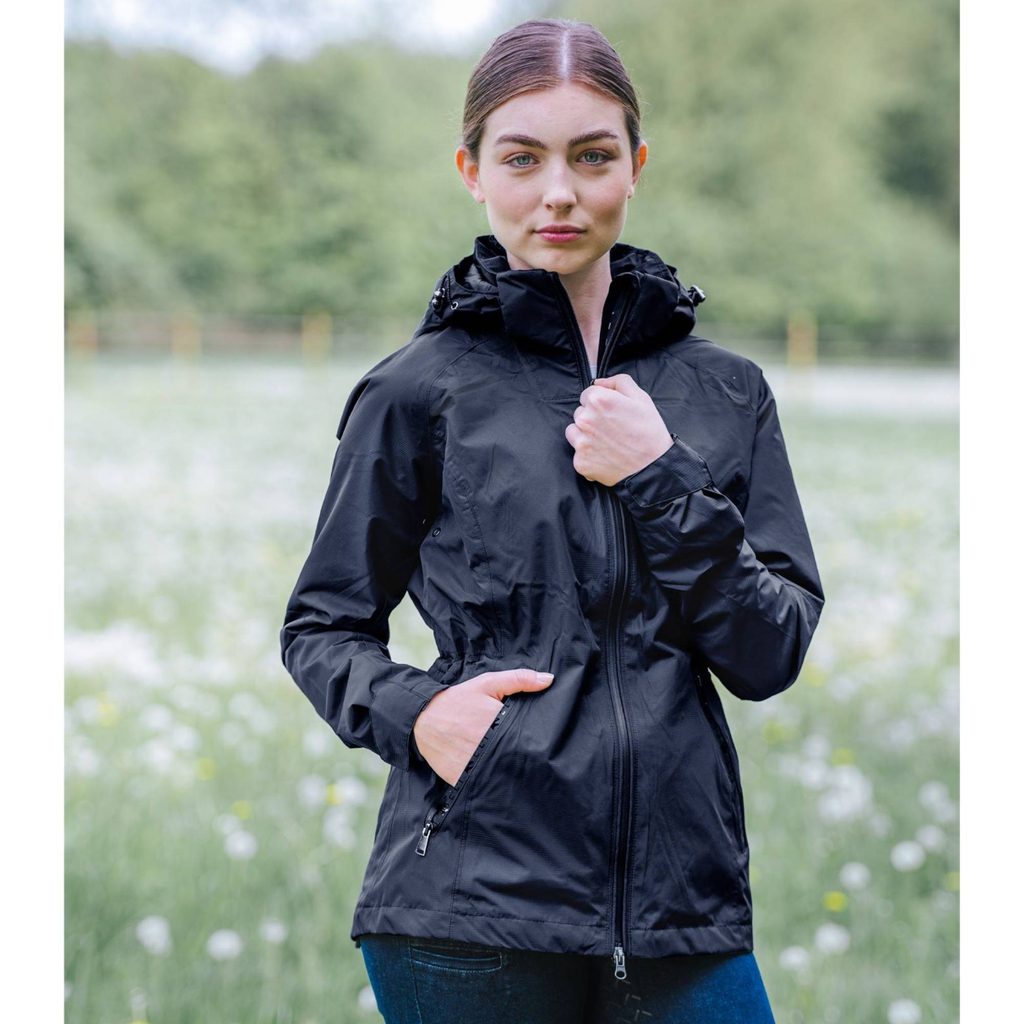 Tato dámská jezdecká bunda má vypasovaný střih, který se přizpůsobí postavě a je vybavena šňůrkou v pase pro snadné přizpůsobení v pase. Je vyrobena z vysoce kvalitního, voděodolného a větruodolného materiálu s vodním sloupcem 5 000 mm a lepenými švy, které zajistí dokonalou ochranu před nepřízní počasí. Bunda je také prodyšná, což zajišťuje komfortní nošení i během aktivního pohybu.