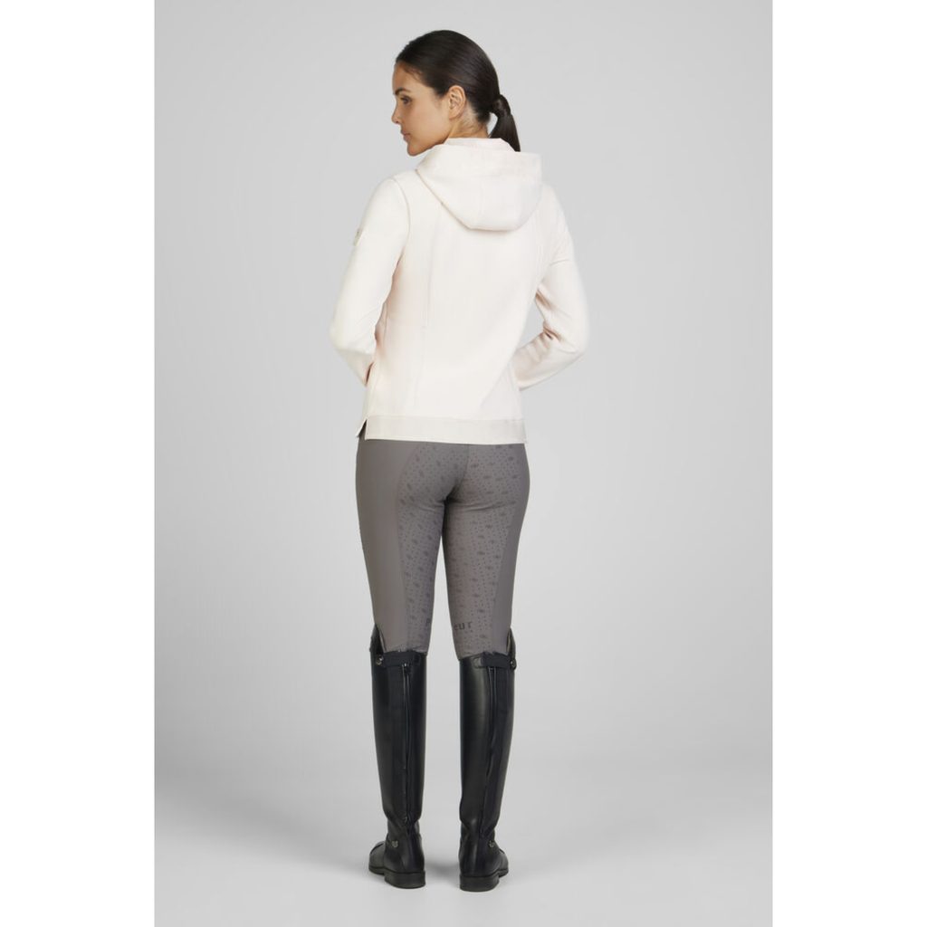 Vyrobena z lehké tkaniny s antistatickou úpravou v kombinaci s elastickými žebrovanými panely, zajišťuje volnost pohybu a pohodlné nošení. Bunda je vybavena dvoucestným zipem s jemnými zlatými proužky a bočními kapsami na zip, které jsou zdobené zlatými detaily. Manžety rukávů mají čistě zakončené okraje, což podtrhuje elegantní vzhled. Na spodním zadním lemu se nachází elastický pásek s potiskem Pikeur Selection, stejně jako na rukávu a kapuci. Integrované magnety v kapuci usnadňují manipulaci a zajišťují, že kapuce drží na svém místě.