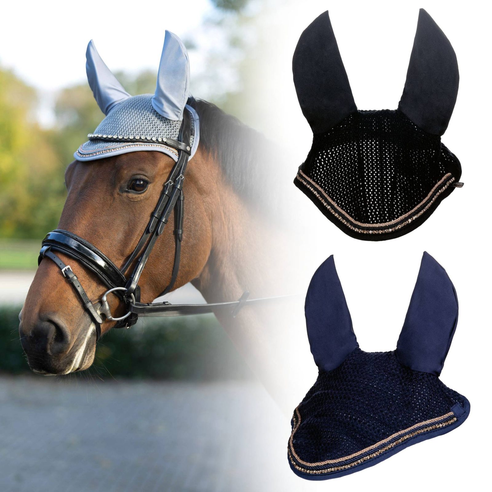 Tato elegantní čabraka je skvělým doplňkem pro každého koně. Je zdobena rosegold lemováním a lesklými kamínky, které jí dodávají zajímavý vzhled. Kromě svého stylového designu perfektně drží na místě a účinně chrání koně před dotěrným hmyzem během tréninků nebo venkovních aktivit. Čabraka poskytuje pohodlí a ochranu, kterou váš kůň potřebuje.