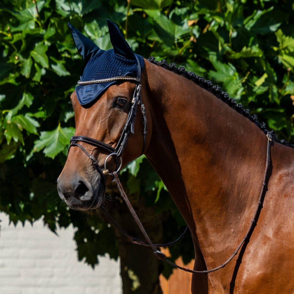 Čabraka na uši Equestrian Stockholm Line Midnight Blue z kolekce 2026 zaujme na první pohled svou poutavou barvou, která působí elegantně, výrazně a svěže. Háčkované provedení v kombinaci s decentním lemováním, elegantní sametovou nášivkou a stylovým odznakem značky vytváří harmonický a luxusní celek, který krásně doplní jezdecký outfit i celkový vzhled koně.