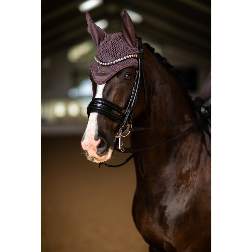 Luxusní háčkovaná čabraka z kolekce Moonless Night nabízí překrásné fialovo hnědé odstíny. Zdobí ji saténová nášivka a kovový štítek Equestrian Stockholm v rose gold barvě. Poskytuje ochranu proti otravnému hmyzu, zároveň také trochu tlumí hluk. Pro dokonalé přizpůsobení jsou uši čabraky elastické.