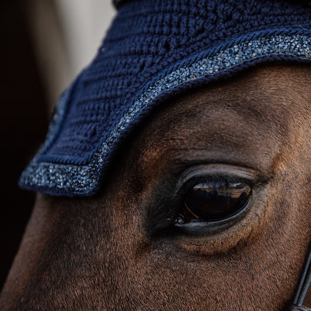 Čabraka Wellington Glitter Stone kombinuje moderní americký design s kvalitou Kentucky Horsewear. Elegantní a stylová, chrání uši koně před mouchami a hmyzem a přitom vyniká luxusními detaily v podobě třpytivého lemování.