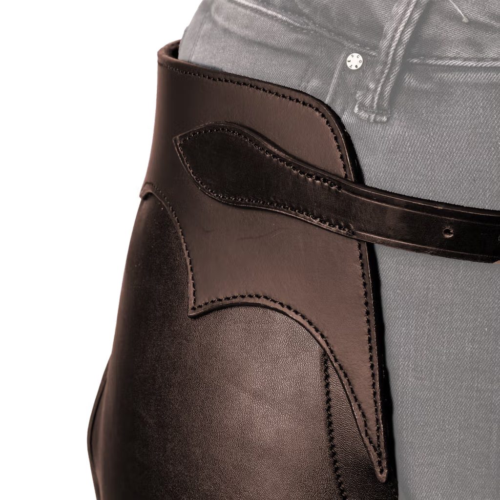 Tyto kožené chaps spojují ochranu, odolnost vůči počasí a maximální výkon. Voděodpudivá kůže udrží vaše nohy suché i během lehkého deště nebo vlhkých podmínek ve stáji. Anatomický střih připomínající druhou kůži a pevné detaily zajišťují výkon i pod tlakem, zatímco nastavitelný pas garantuje pohodlí bez kompromisů v bezpečnosti.