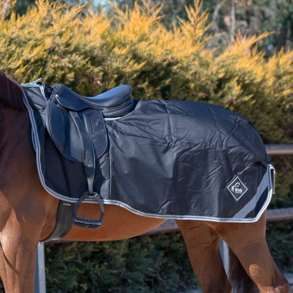 Trvanlivý vnější materiál RipStop s hedvábnou podšívkou. Jednoduché a rychlé připevnění, možnost deku zapnout pod bočnicí sedla nebo přes stehna jezdce.