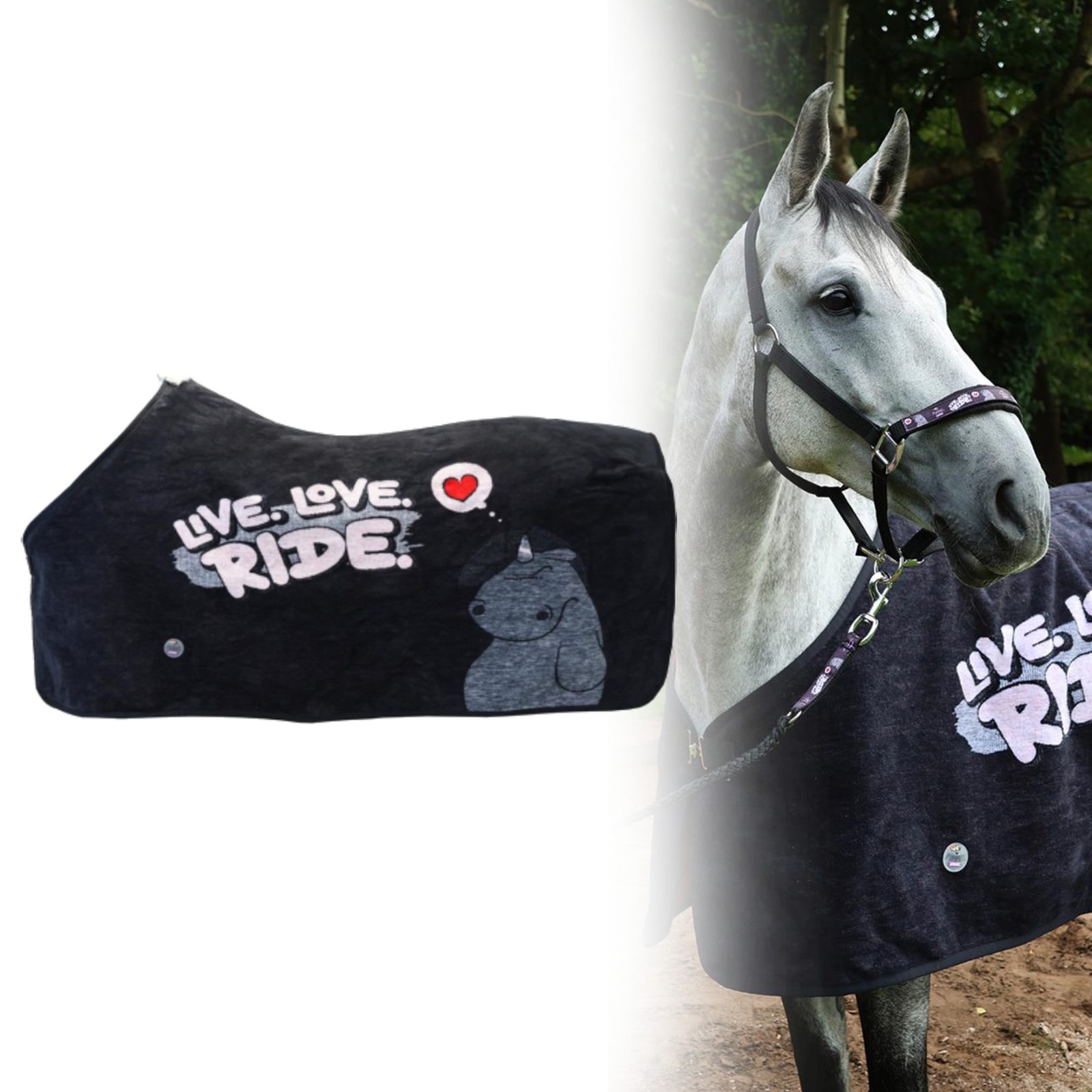 Užijte si příjemné chvíle se svým koněm a vysoce kvalitní dekou Dralon. Zdobí ji motiv Pummel s inspirativním mottem "Live Love Ride". Použitý materiál nabízí výjimečné tepelné vlastnosti s gramáží 400 g/m². Díky ergonomickému střihu, jednoduché podocasní šňůře a vysoké hmotnosti optimálně padne a předchází tření. Perfektně ladí k ostatnímu vybavení z této kolekce.