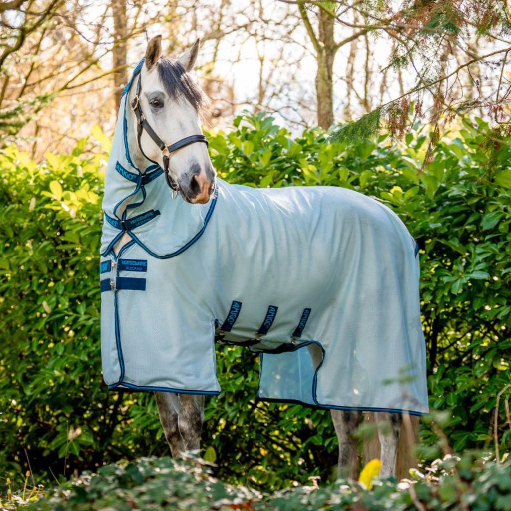 Tato prodyšná a extrémně odolná síťovaná deka poskytuje 65% UV ochranu a kompletní krytí od hlavy až k ocasu, čímž účinně minimalizuje podráždění způsobené hmyzem. Extra široká břišní klopa se třemi přezkami a suchým zipem zajišťuje bezpečné a pohodlné uchycení. Díky klenutému střihu v oblasti nohou deka perfektně padne, přičemž neomezuje pohyb.