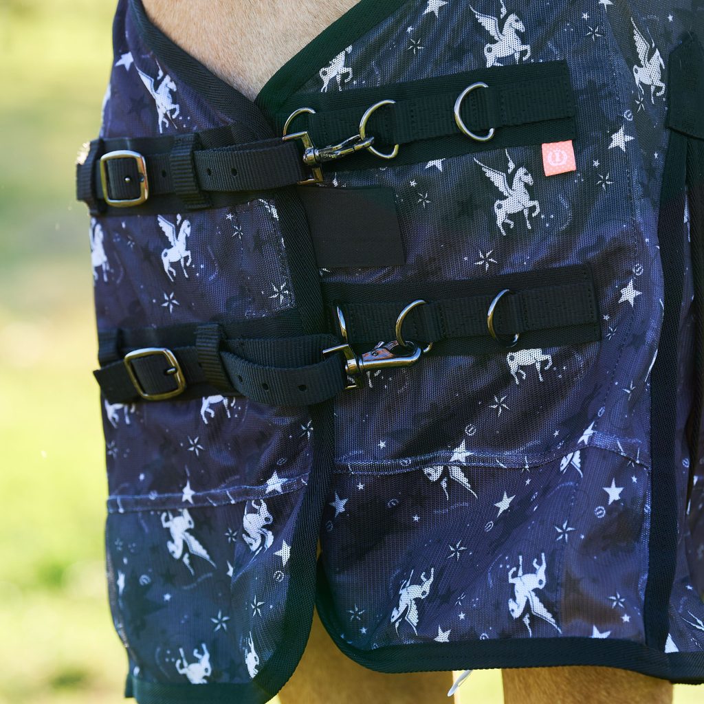 Je vyrobena z jemné síťoviny, která je příjemná na nošení a zároveň poskytne účinnou ochranu před dotěrným hmyzem. Je navržena s designovým potiskem pegasů, který spolehlivě zaujme a zároveň je prokázáno, že odpuzuje mouchy. Také zabraňuje vyšisování srsti koně vlivem slunce. Na plecích a krku je vybavena nylonovou podšívkou a na kohoutku je podložena umělým beránkem, který předchází tření. Spolehlivě na svém místě ji drží přední zapínání na přezku a suchý zip, křížové zapínání pod břichem, popruhy mezi zadní nohy a popruh pod ocas. Kromě toho má extra dlouhý kryt ocasu, který zaručuje ještě větší ochranu.