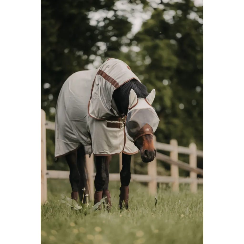Tato deka nabízí vynikající poměr cena/výkon. Lehká a prodyšná strukturovaná síťovina chrání před hmyzem a zbytečně nehřeje. Světlá barva odráží slunce a udržuje koně v chladu. Deka je v potřebných místech podložená hladkou polyesterovou podšívkou, která zabraňuej odření.