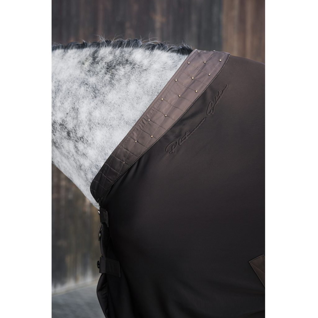 Lesklý odolný materiál Dura na horní straně je doplněn fleecem z vnitřní strany. Elegantní límec je ozdobně prošívaný s našitými třpytivými kamínky. Přední zapínání na dvě T přezky je ještě podloženo zapínáním na suchý zip. Deka disponuje odnímatelným křížovým zapínáním. Na místě ji ještě jistí podocasní šňůra. Velmi snadno se udržuje a je odolná proti nečistotám.