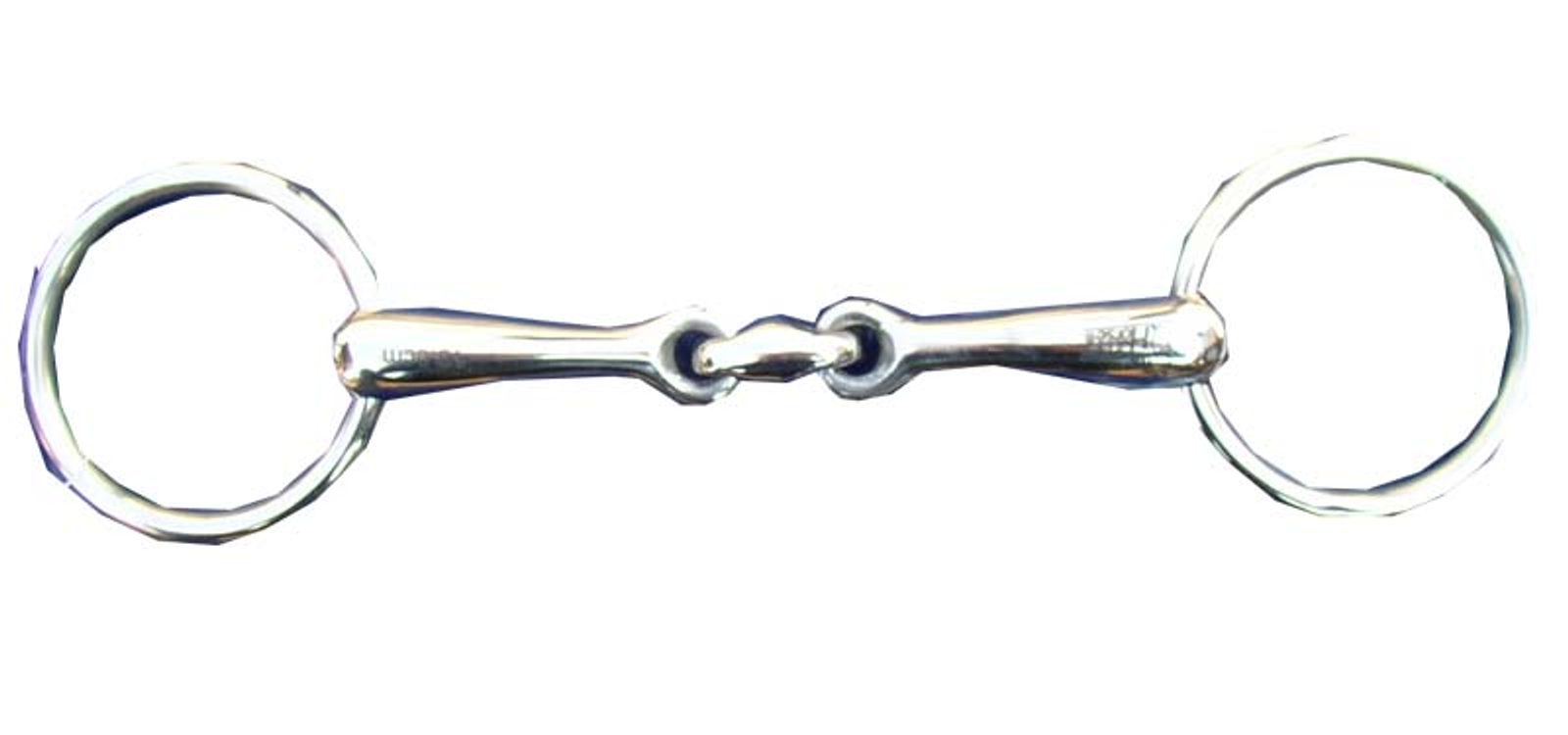 Standardní provedení jemného 2xlomeného drezurního stihla s oválným středním dílem. Vhodné k nerezové drezurní páce nebo i jako samostatné udidlo. Tloušťka udítka 14 a 16mm. Velikosti 13, 14 a 15 cm.