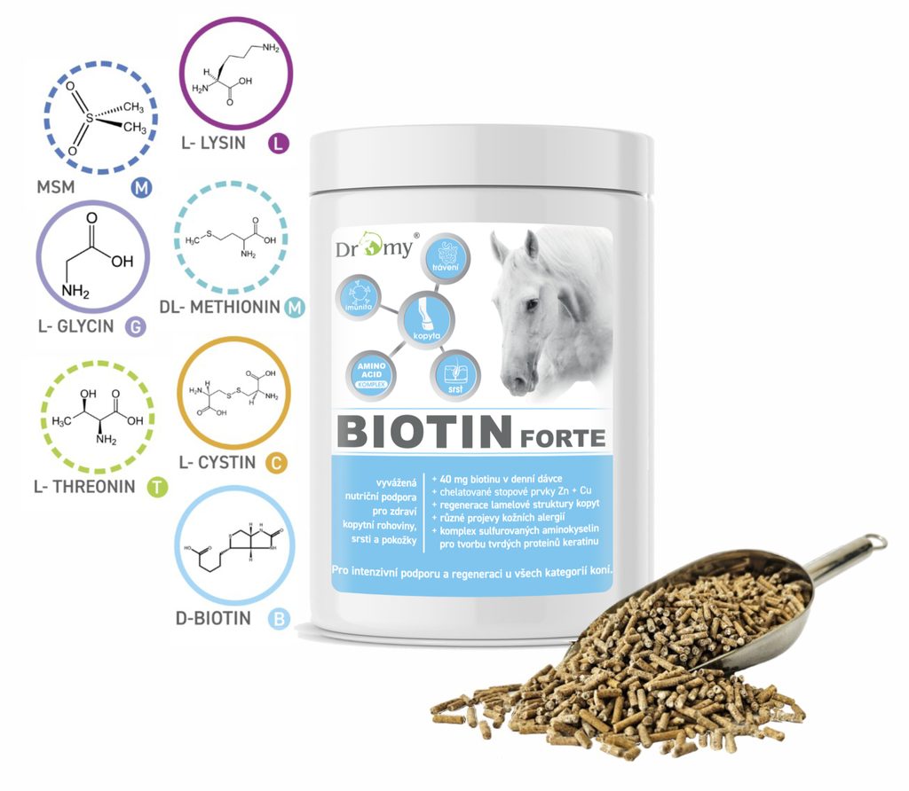 Biotin Forte je velmi pokročilá super koncentrovaná granulovaná forma, zaměřená na přímou nutriční podporu kopytní rohoviny, srsti a pokožky.
