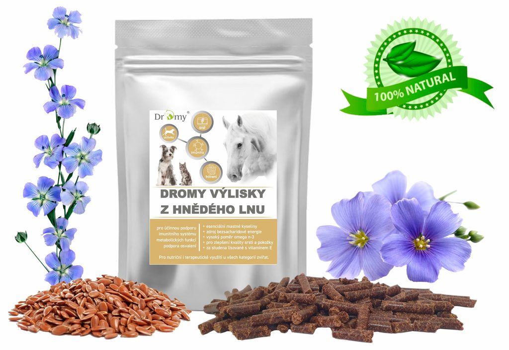 Dromy lněné výlisky, jsou dietetickým zdravým krmivem pro koně všech kategorií, obsahující zdroj nenasycených mastných kyselin omega 3 a vlákninu a další zdraví prospěšné látky.
