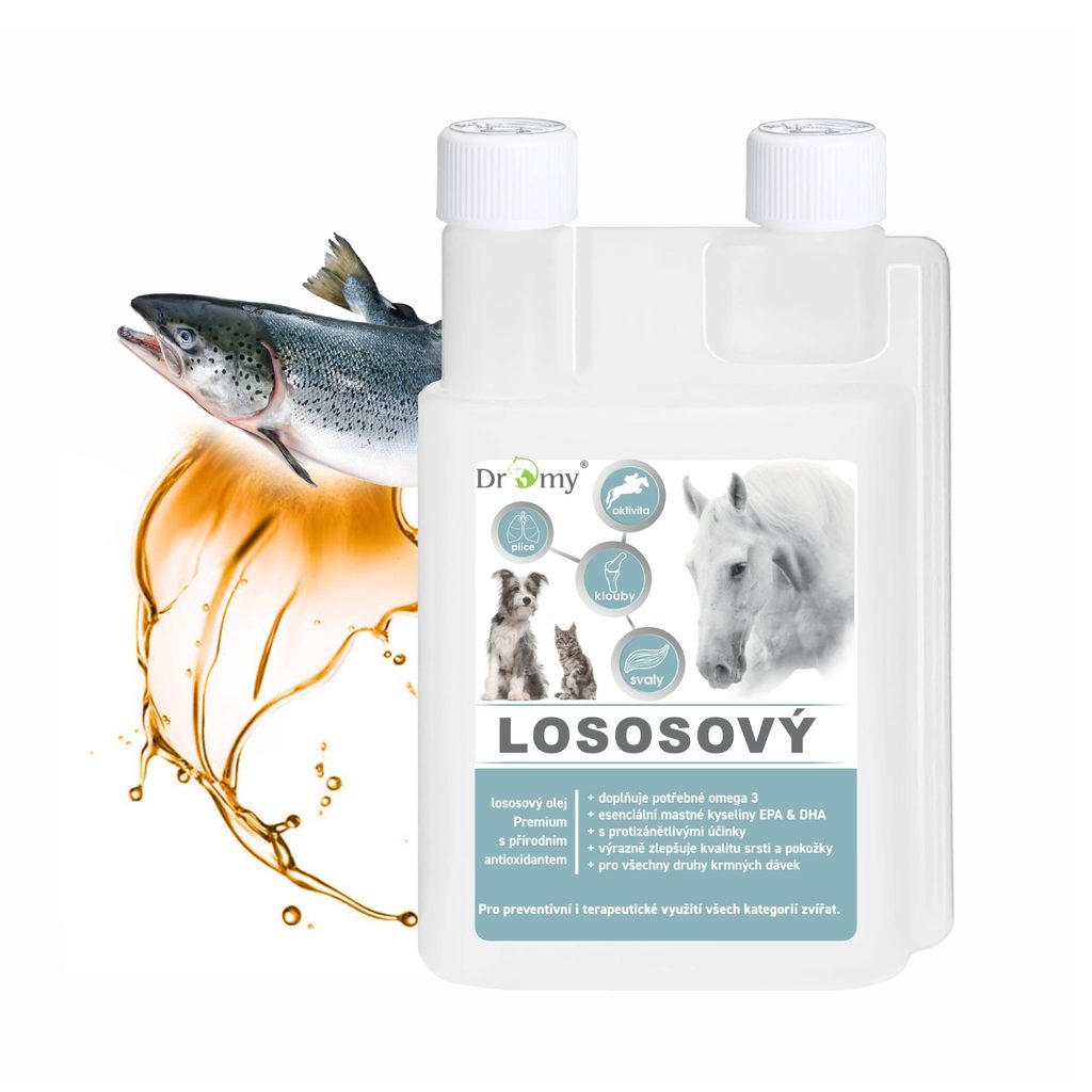 Lososový olej Premium, je přírodním zdrojem nenasycených mastných kyselin, které jsou z nutričního hlediska pro psy a kočky základním materiálem pro tvorbu a funkci buněčných membrán. Jsou zcela nepostradatelné pro transportní mechanismy a funkce enzymatických systémů. Esenciální mastné kyseliny DHA (kyselina dokosahexaenová) a EPA (kyselina eikosapentaenová) jsou nejvýznamnější složkou oleje. Tyto kyseliny si organismus nevytváří sám a jejich příjem do organismu je zcela závislý na dietě. Příznivě ovlivňují kardiovaskulární, svalový, nervový, respirační, imunitní i trávicí systém. Nedostatek esenciálních mastných kyselin se může projevit snížením obranyschopnosti organismu, únavou, změnou stavu pokožky, únavou, poruchou růstu i reprodukce. Játra jsou hlavním místem regulace činnosti při látkové výměně. Prostřednictvím fosfolipidů se podílejí na tvorbě lipoproteinů, které hrají podstatnou roli při transportu tuků.