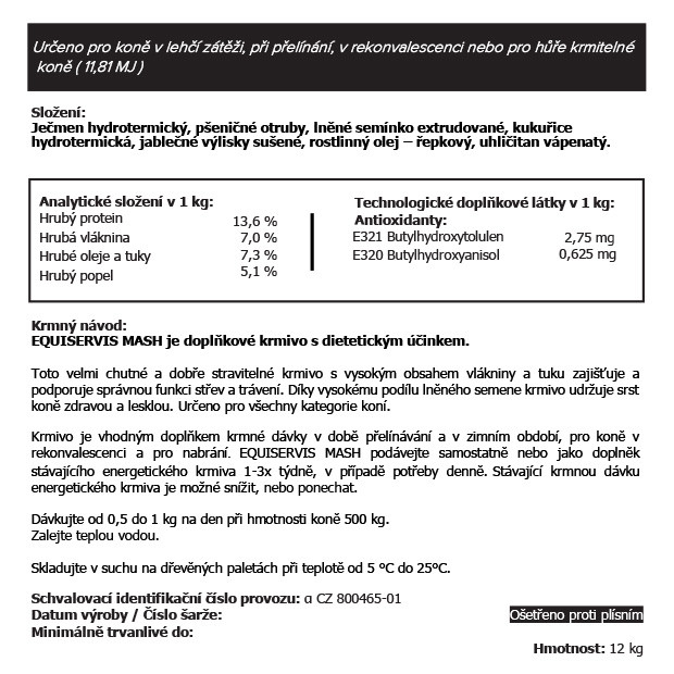 Dietetické doplňkové krmivo pro koně. Určeno pro koně v lehčí zátěži, při přelínání, v rekonvalescenci nebo hůře krmitelné koně. Chutné dobře stravitelné krmivo s vysokým obsahem vlákniny a tuku zajišťuje a podporuje správnou funkci střev a trávení. Díky vysokému podílu lněného semene krmivo udržuje srst koně zdravou a lesklou. Určeno pro všechny kategorie koní.