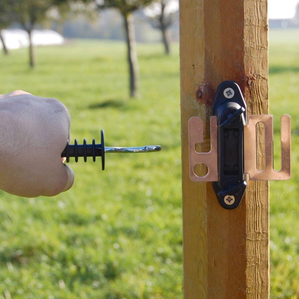 Usnadňuje otvírání a zavírání vstupu do ohrady. Po otevření se vodivý materiál automaticky navine ocelovou pružinou - již nikdy žádná prověšená lanka, nebo lanka ležící na zemi! Předchází znečištění materiálu. Nezachycuje chlupy, ani žíně z ocasu. Připevňuje se s pomocí vrutů přímo k sloupku. Propojovací kabel není součástí balení.