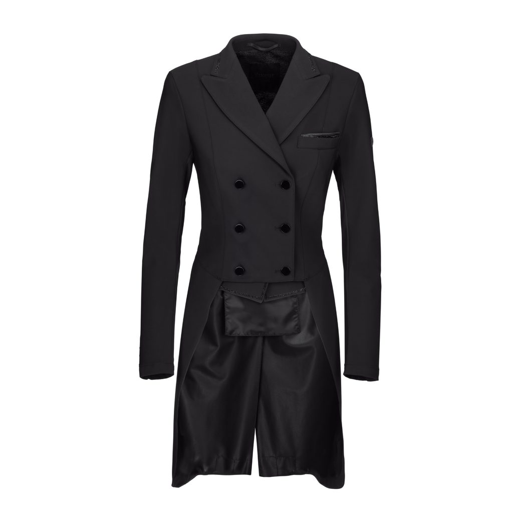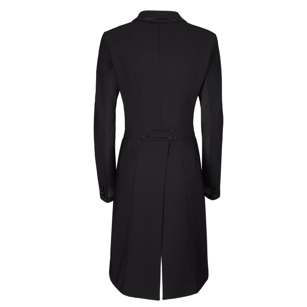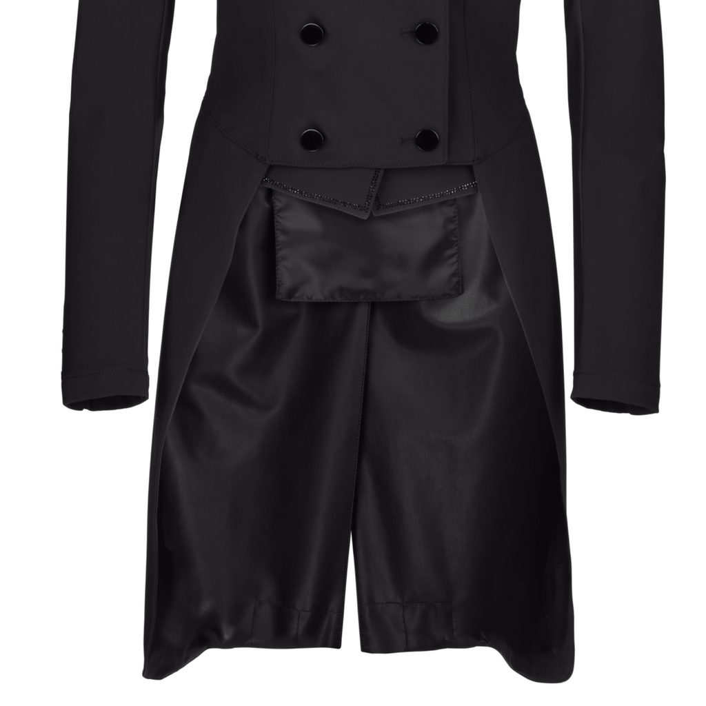 Luxusní dámský frak s detailně propracovaným střihem. Příjemný materiál je pružný, nemačkavý a neulpívají na něm nečistoty. Pro zachování svěžího pocitu má vsadky ze síťoviny na spodní straně rukávů a v podpaží. Jsou tak dobře zakomponované, že neruší eleganci a umožňují skvělou prodyšnost. Dlouhé zadní šosy jsou z vnitřní strany podloženy hladkou umělou kůží a zatíženy všitými závažíčky pro neustále dokonalý vzhled. Závažíčka jsou promyšleně rozložena. V každém šosu jsou tři ve speciálních všitých kapsách, díky kterým drží tam, kde mají a nebudou nikde cestovat. Pružnost tkaniny vám umožní soustředit se pouze na výkon, když bude lehce kopírovat vaše pohyby. Ramenní vycpávky zajišťují dokonalé proporce siluety. Límec a bedra zdobí kamínkový vzor v barvě fraku.