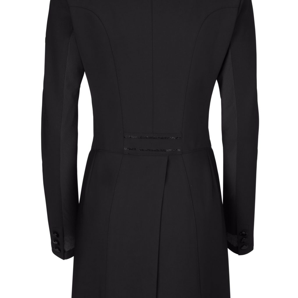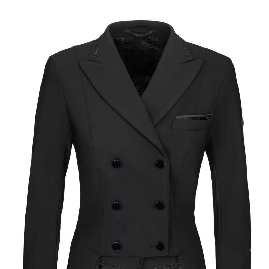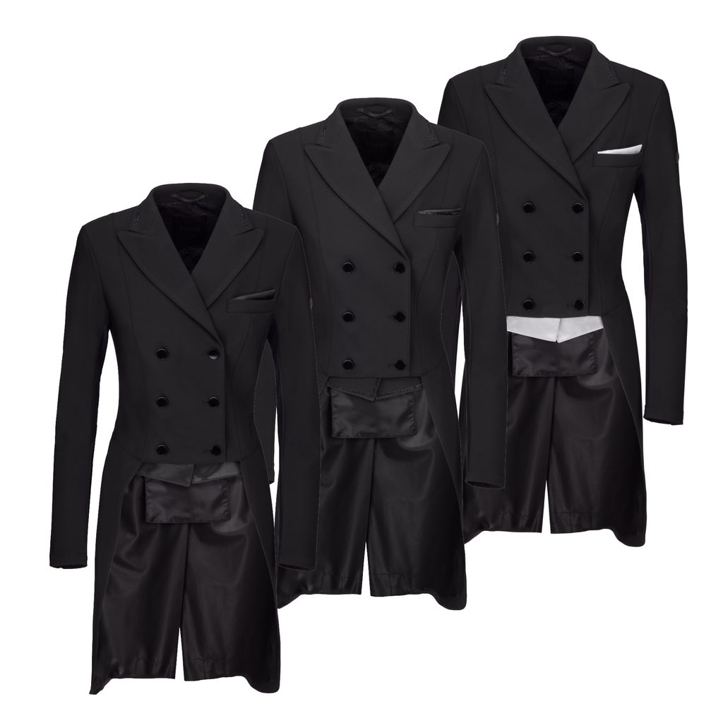 Luxusní dámský frak s detailně propracovaným střihem. Příjemný materiál je pružný, nemačkavý a neulpívají na něm nečistoty. Pro zachování svěžího pocitu má vsadky ze síťoviny na spodní straně rukávů a v podpaží. Jsou tak dobře zakomponované, že neruší eleganci a umožňují skvělou prodyšnost. Dlouhé zadní šosy jsou z vnitřní strany podloženy hladkou umělou kůží a zatíženy všitými závažíčky pro neustále dokonalý vzhled. Závažíčka jsou promyšleně rozložena. V každém šosu jsou tři ve speciálních všitých kapsách, díky kterým drží tam, kde mají a nebudou nikde cestovat. Pružnost tkaniny vám umožní soustředit se pouze na výkon, když bude lehce kopírovat vaše pohyby. Ramenní vycpávky zajišťují dokonalé proporce siluety. Límec a bedra zdobí kamínkový vzor v barvě fraku.
