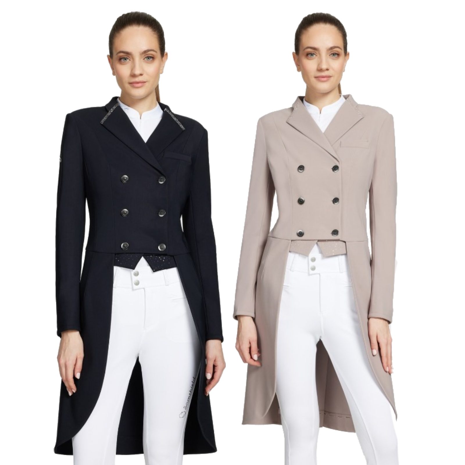 Bez námahy kombinuje vysoce kvalitní italské látky s třpytivými krystaly Swarovski. Svrchní látka je perforovaná a strečová ve všech čtyřech směrech pro pocit druhé kůže a vysokou prodyšnost. Poskytuje maximální svobodu pohybu a komfort pro jezdce. Skrytý zip za knoflíky efektivně tvaruje siluetu. Zadní šosy jsou vybaveny vnitřními kapsami s odnímatelným závažím.