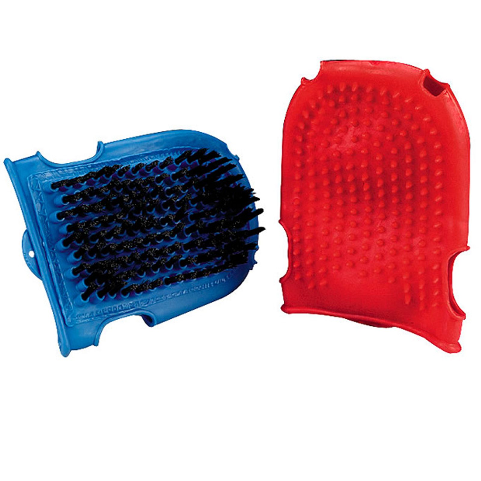 Rukavice k mytí koně s kartáčem na straně jedné a masážním povrchem na straně druhé. Mix barev.