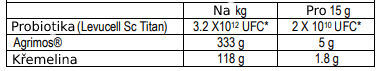 Mikroenkapsulovaná probiotika (Levucell Sc Titan): mikroenkapsulace umožňuje chránit probiotikum před žaludečními šťávami při trávení. Extrémně účinné, když se dostane do střeva. Velmi vysoký obsah GUT SUPPORT (20 miliard CFU*/15g) chrání zdraví mikroflóry, podporuje růst prospěšné bakterie, zlepšuje účinnost krmné dávky.