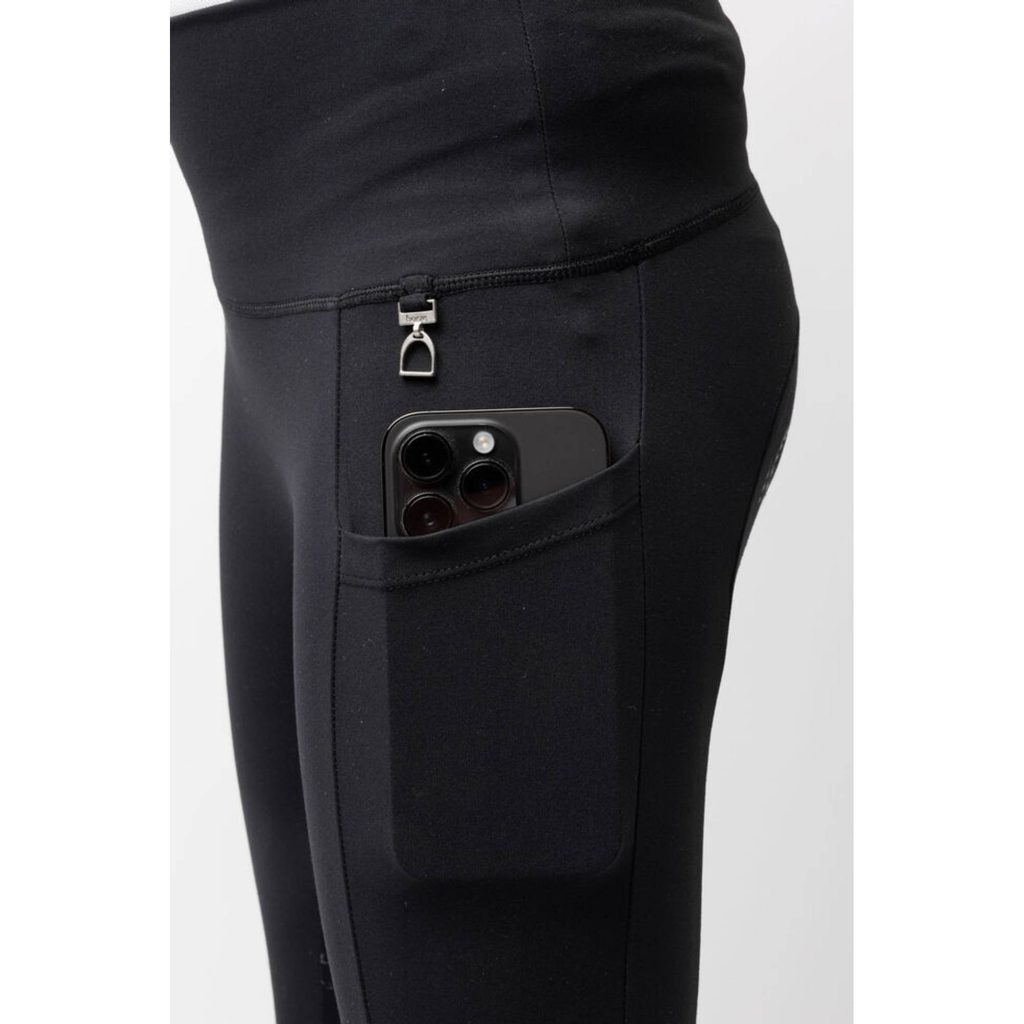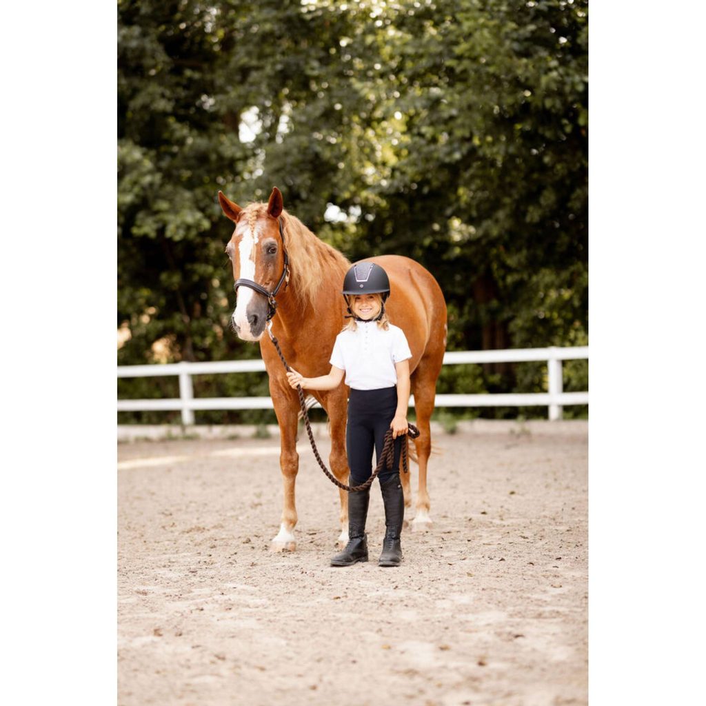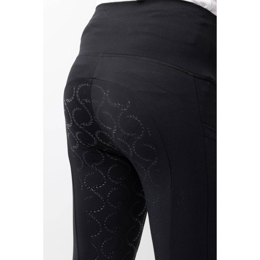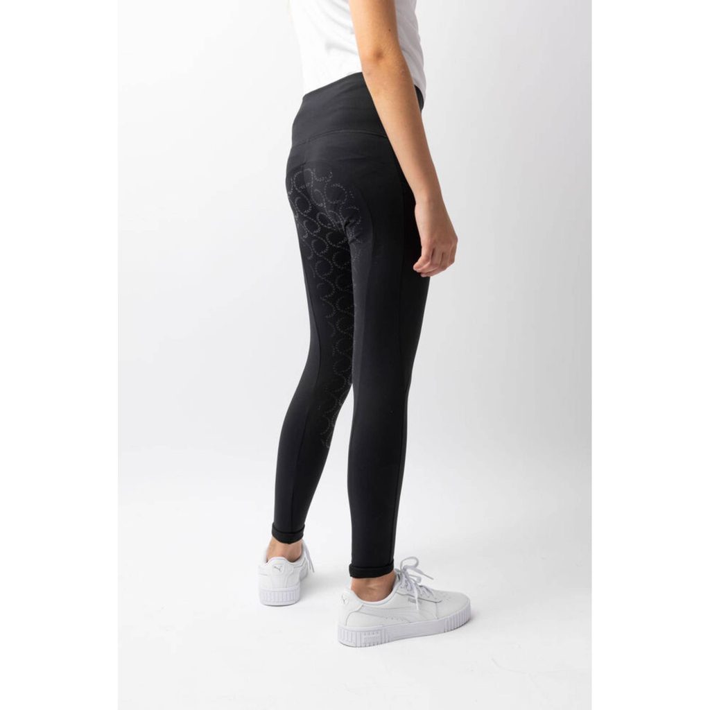 Legíny jsou ušity ze zpevňujícího materiálu s kompresní funkcí. Poskytují nohám malých jezdců maximální oporu při jízdě. Zároveň jsou příjemně prodyšné. Mají snadno přístupné kapsy na stehnech. Celogripový sed díky svým protiskluzovým vlastnostem dodává větší stabilitu v sedle.