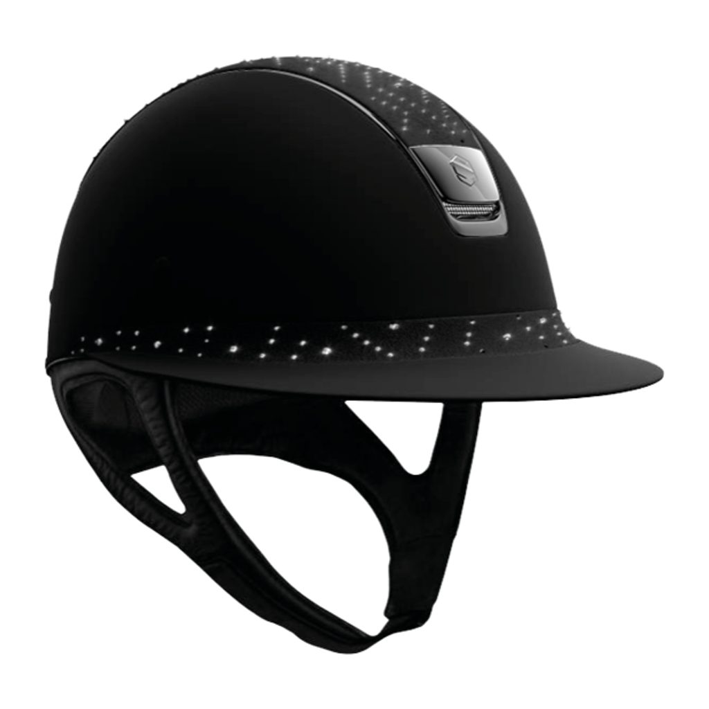 Jezdecká Ochranná Helma Samshield MissShield Aztec. Tento model je zdoben kamínky Swarovski s matným černým lemováním a logem značky umístěným přímo uprostřed zdobného pásu. Kamínky jsou umístěny tak, aby připomínaly aztécké vzory, čímž helmu velmi pěkně ozvláštňují.