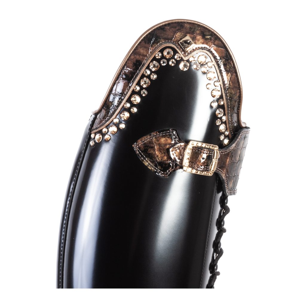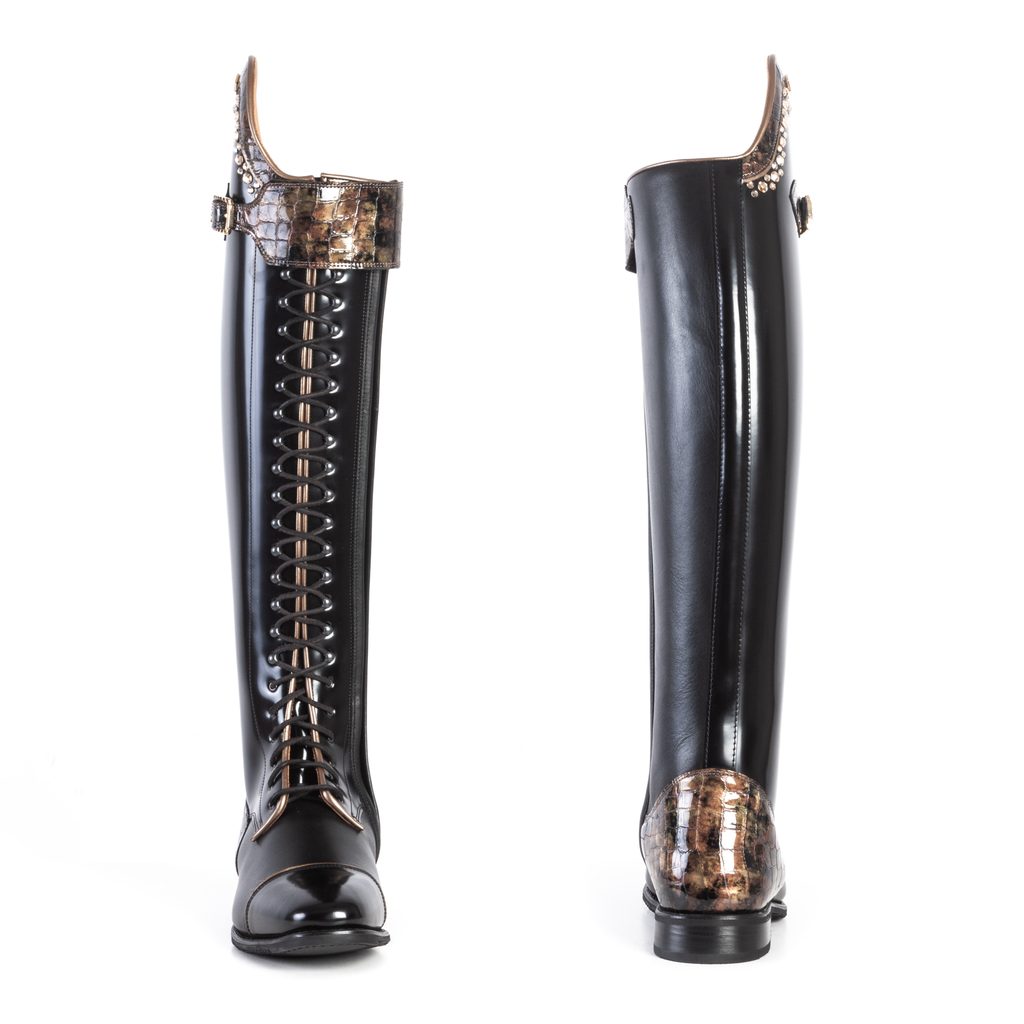 Působí vysoce elegantně a luxusně díky svému šněrování přes celou délku boty. Disponují zapínáním na zip na boční straně, vyztužením na vnější straně holeně a velmi kvalitní a trvanlivou dvakrát přišitou vibramovou podrážku. Stélka z aktivního uhlí spolehlivě tlumí nárazy. Jedinečnými je tvoří neobyčejně poutavé zdobení topu a paty a kamínky Swarovski. Jsou vyrobeny z velmi kvalitní telecí kůže.