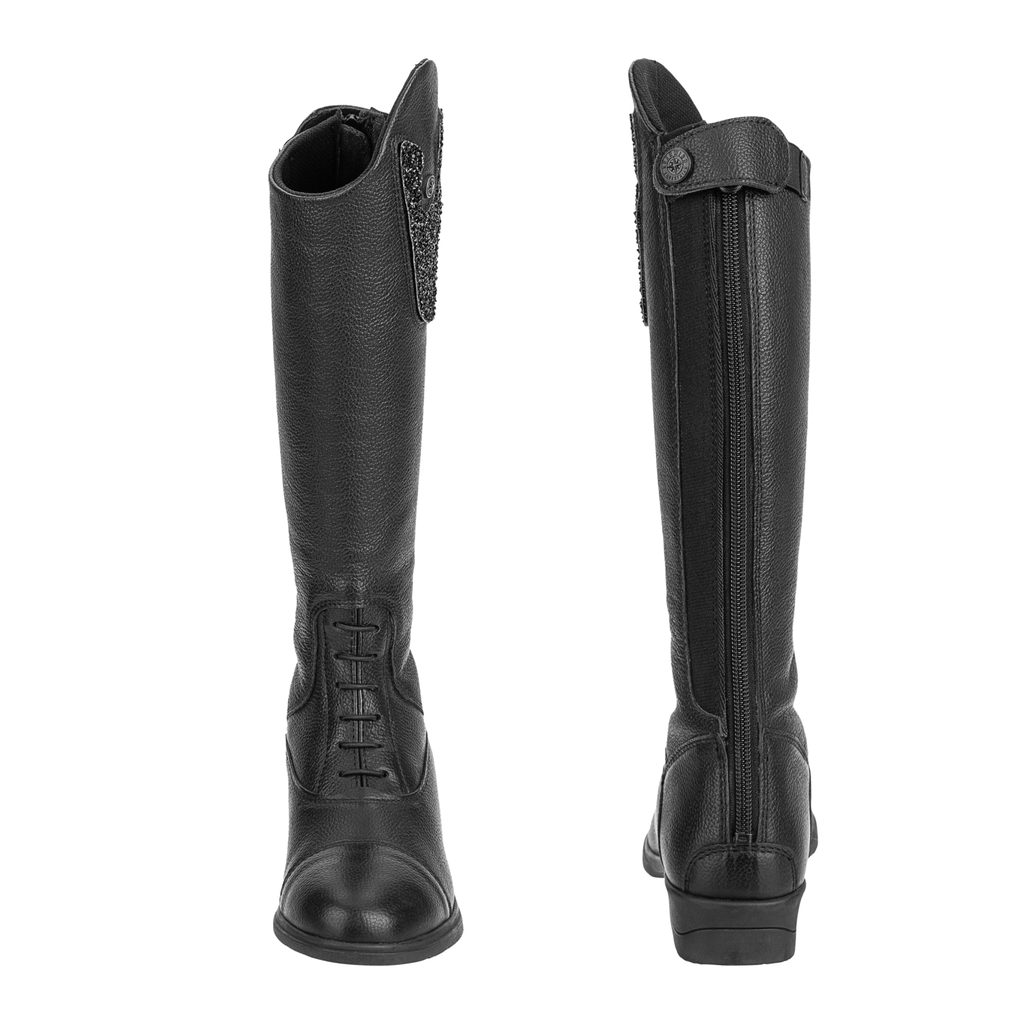 Vysoké jezdecké boty krásně drží nohu, chrání ji před odřením a nyní jsou i hravé díky vyměnitelným prvkům. Tato dětská jezdecká bota nabízí prodyšnou podšívku ze síťoviny, zadní zip YKK®, který je lemovaný strečovou vsadkou, pružné tkaničky na nártu pro ještě lepší přizpůsobení a OrthoLite® pohodlnou stélku s pryžovou podrážkou NOVA. Samozřejmostí je, že je bota ušita z měkké kůže. Královským prvkem boty je vyměnitelná ozdobná manžeta v horní části. S tou se velmi snadno manipuluje díky suchému zipu. Bota je dodávána s klasickou černou manžetou, ostatní lze zakoupit dle vlastních preferencí za velmi příznivou cenu.