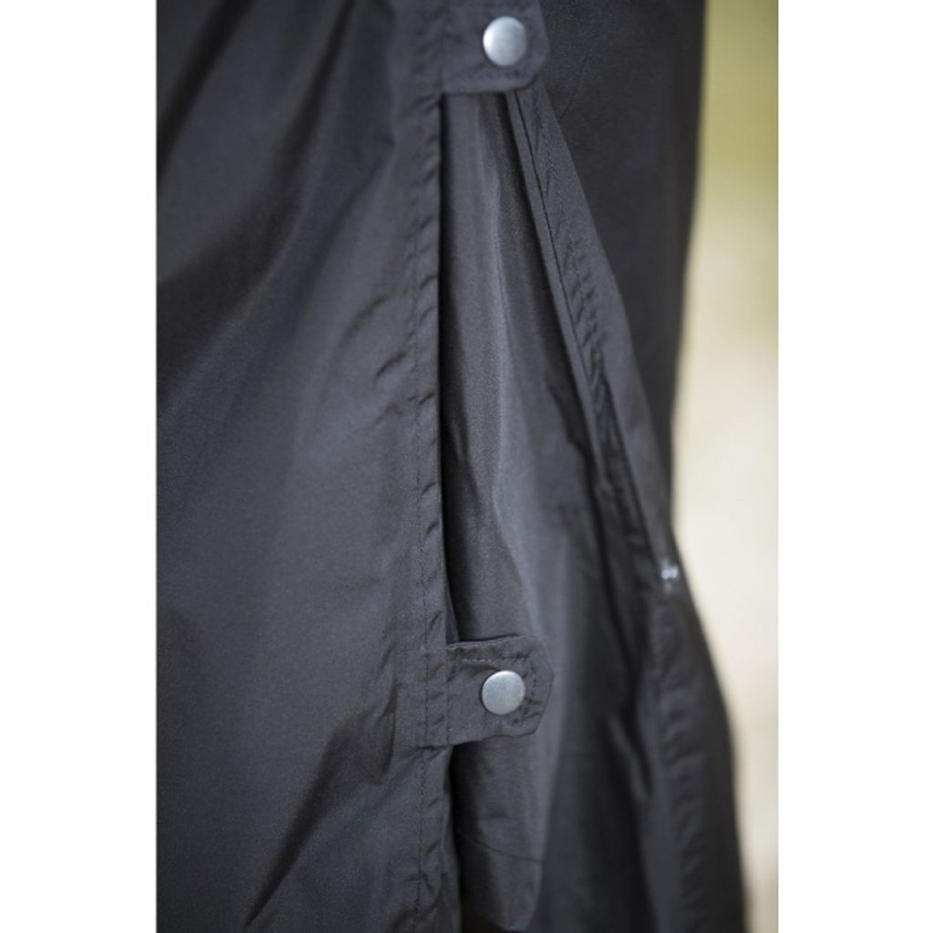 Nepromokavý jezdecký kabát od značky HKM. Dlouhý střih až pod kolena. Odolá vodě, větru i nečistotám. Vybaven velkou kapucí a vnitřními popruhy pro připnutí ke stehnům. Zapínání na dvoucestný zip, který je chráněn légou s druky. Dvě prostorné vnější kapsy, vzadu vysoký rozparek na druky, který má podšívku, aby bylo sedlo i vaše pozadí dobře chráněno před deštěm a větrem. Vodní sloupec 3000 mm. Lze prát v pračce na 30°C. Barva: černá. Velikost: M, L. Materiál: 100% polyester.
