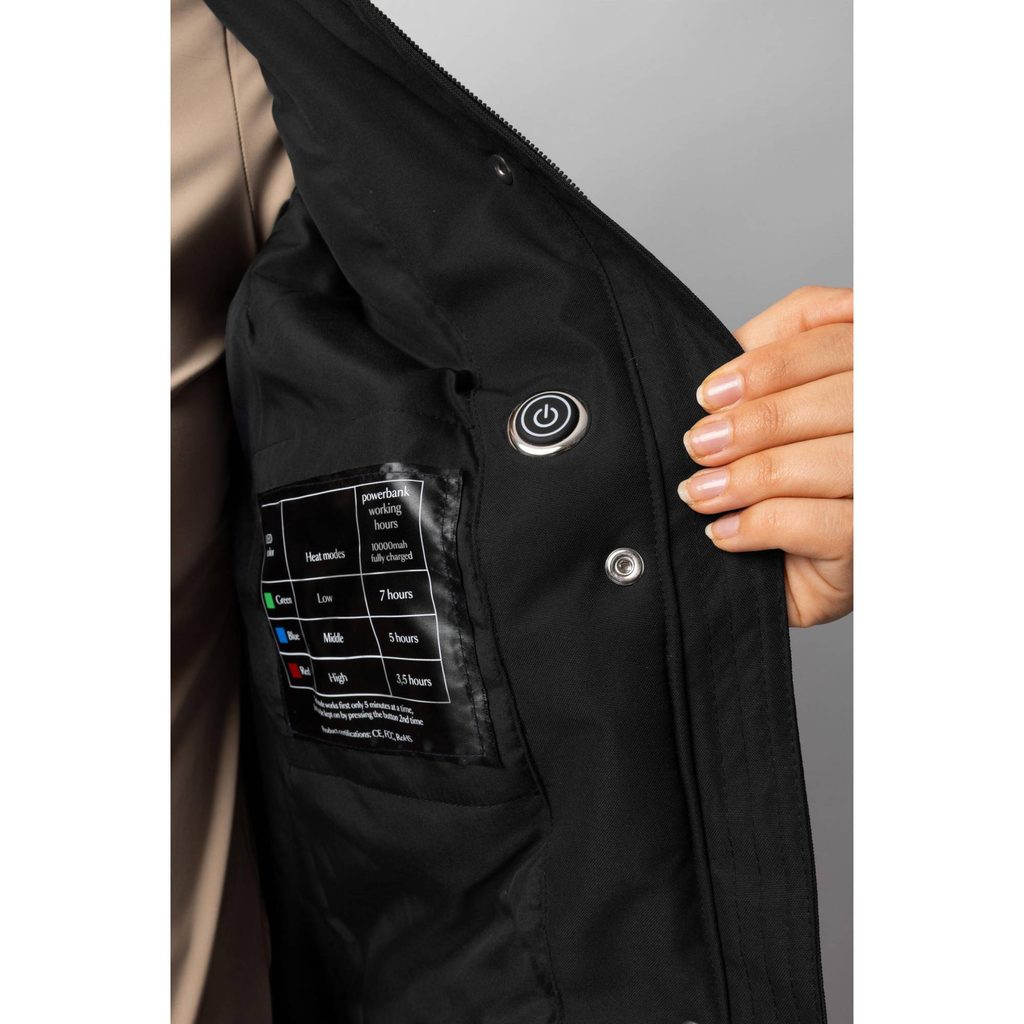 Prodloužený střih a nastavitelný pas zajišťují perfektní siluetu a pohodlí při jízdě i práci ve stáji. Praktické pružné panely poskytují volnost pohybu, zatímco dvojité náprsní kapsy a větší přední kapsa na powerbanku usnadňují používání během dne. Powerbanka (není součástí balení) se jednoduše připojí přes USB port a umožňuje provoz až 7 hodin v závislosti na zvoleném režimu ohřevu.