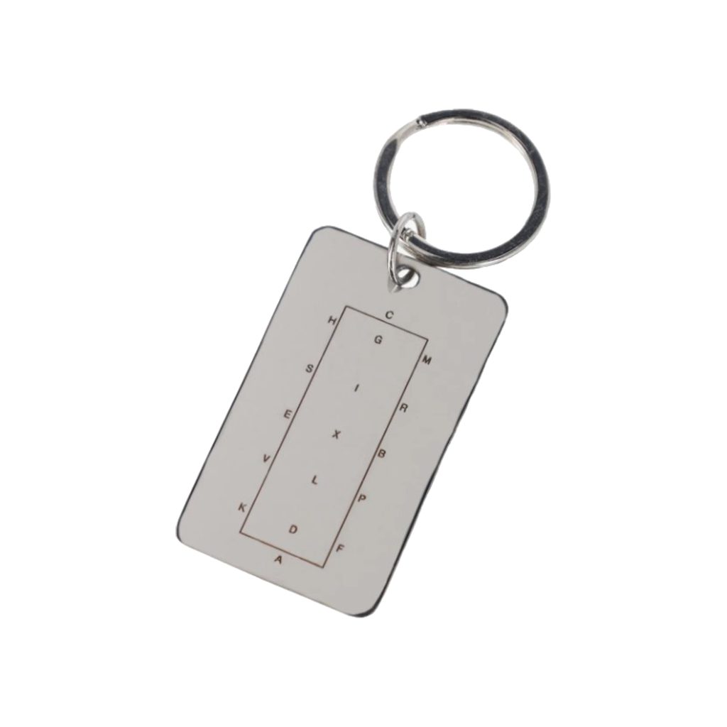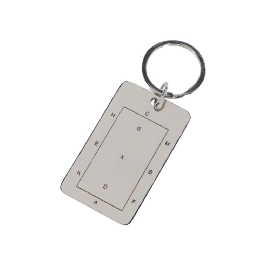 Klíčenka ve tvaru drezurního obdélníku s písmeny od značky QHP.