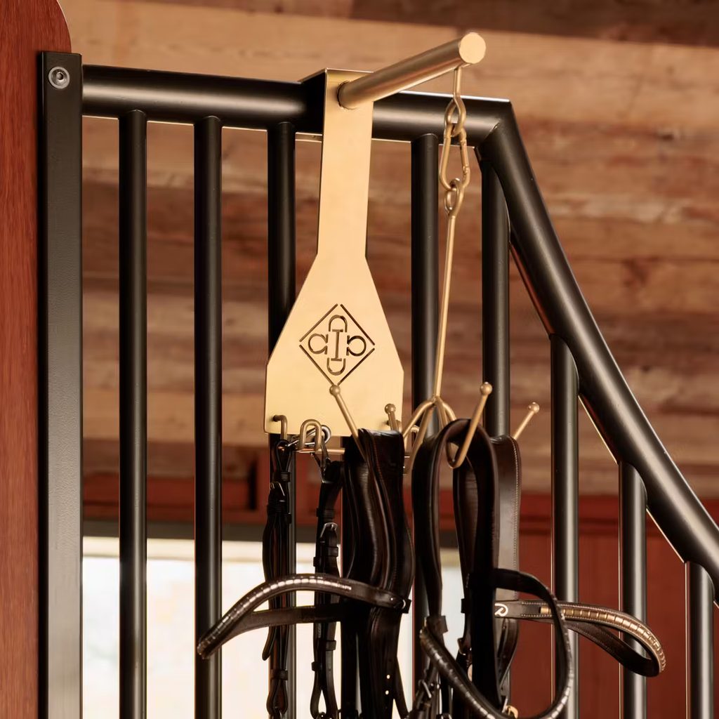 Je ideálním řešením pro přehledné uspořádání uzdeček, ohlávek a dalšího jezdeckého vybavení. Je vyroben z odolné oceli s prémiovou povrchovou úpravou, která zajišťuje dlouhou životnost a ochranu proti opotřebení i korozi. Čtyři pevná ramena nabízí dostatek prostoru pro uložení uzdeček, zatímco dva přídavné háčky umožní zavěšení dalších doplňků. Konce hrotů jsou opatřeny ochrannou kuličkou, aby se předešlo poškození výstroje, či poranění koně.