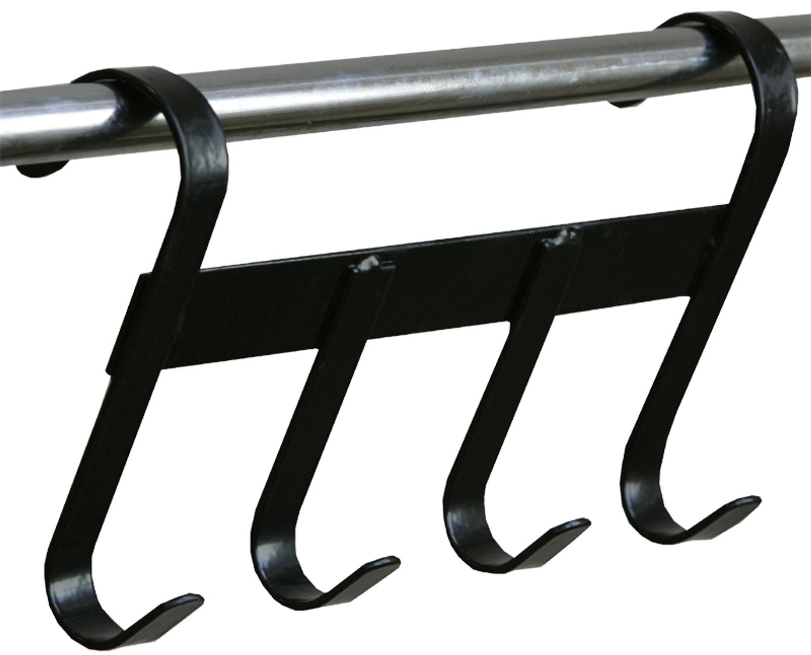 Věšák k zavěšení na horní hranu boxu pomocí 2 praktických háků. Umožňuje zavěsit uzdečky a stájovky variabilně na box a mít je tak pořád po ruce. Velmi vhodné pro použití na závodech. Kovová konstrukce, černá barva.