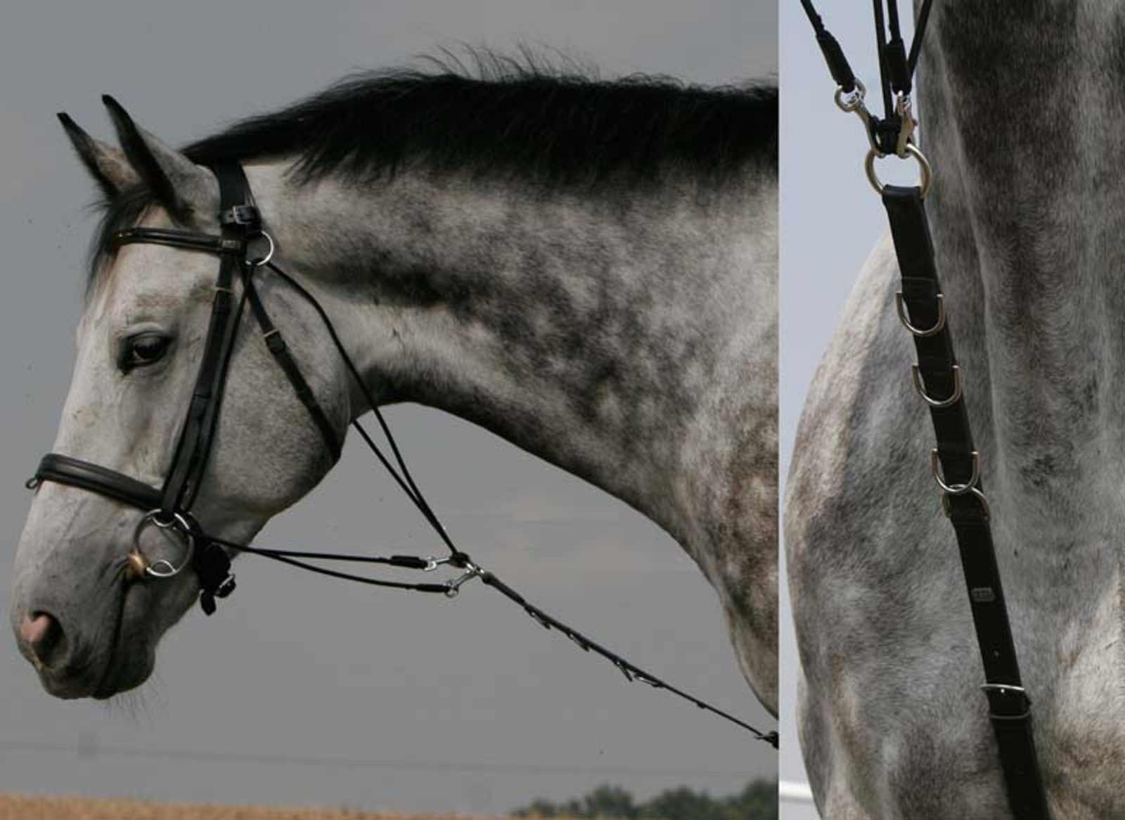 Lonžovací pomůcka, vyrobená z pevné kůže, kvalitního provázku a karabin. Čtyři přidaná očka na středovém dílu umožňují nastavení různé délky. Zapíná se mezi nohama koně přes speciální nátylník, provlékne se skrz udidlo a upevní se do kroužku na kožené části gogue. Barva černá. Velikost full. Vlastní výroba Equiservis se zárukou 5 let.