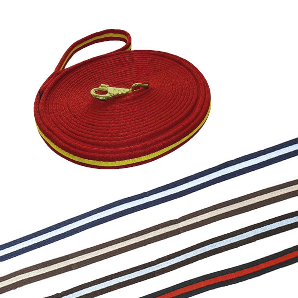 Velmi příjemná a měkká lonž s karabinou ve zlaté barvě. Délka 8m. Barvy: černá/šedá, černá/červená, červená/žlutá, bordo/šedá, čoko/béžová, čoko/sv.modrá, modrá/sv.modrá, fialová/černá, černá, červená, hnědá, fialová.