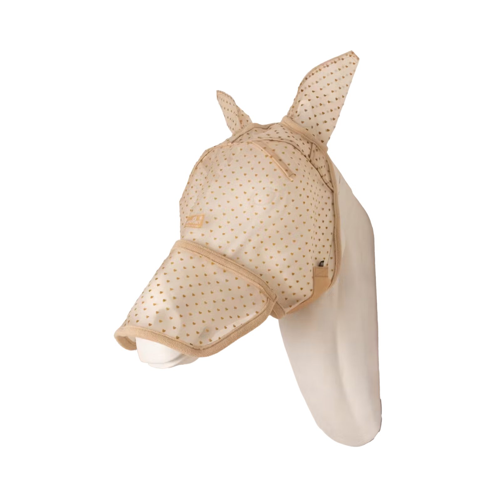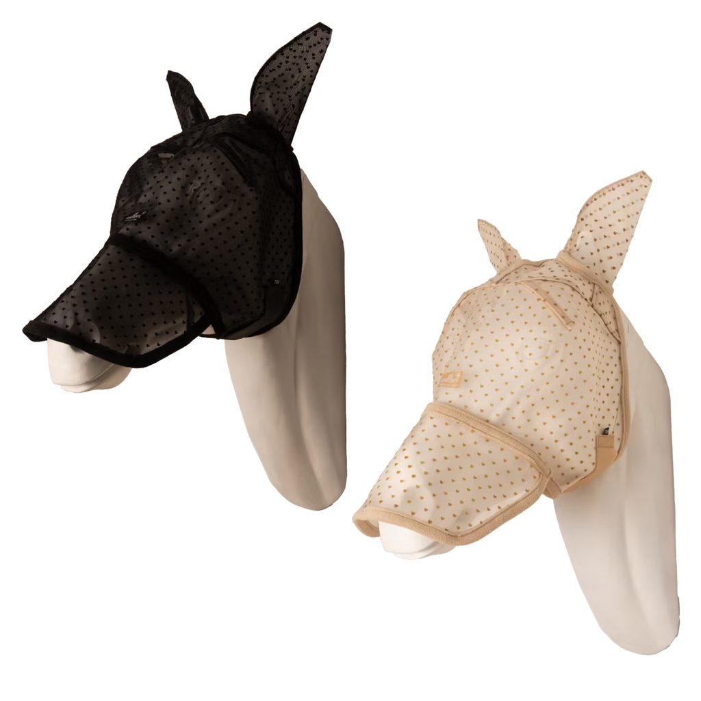 Praktickým detailem je odnímatelný nosní díl upevněný pomocí suchého zipu, díky kterému lze masku snadno přizpůsobit aktuálním potřebám koně. Decentní vzor malých srdíček dodává masce jemný, elegantní vzhled bez rušivého efektu.
