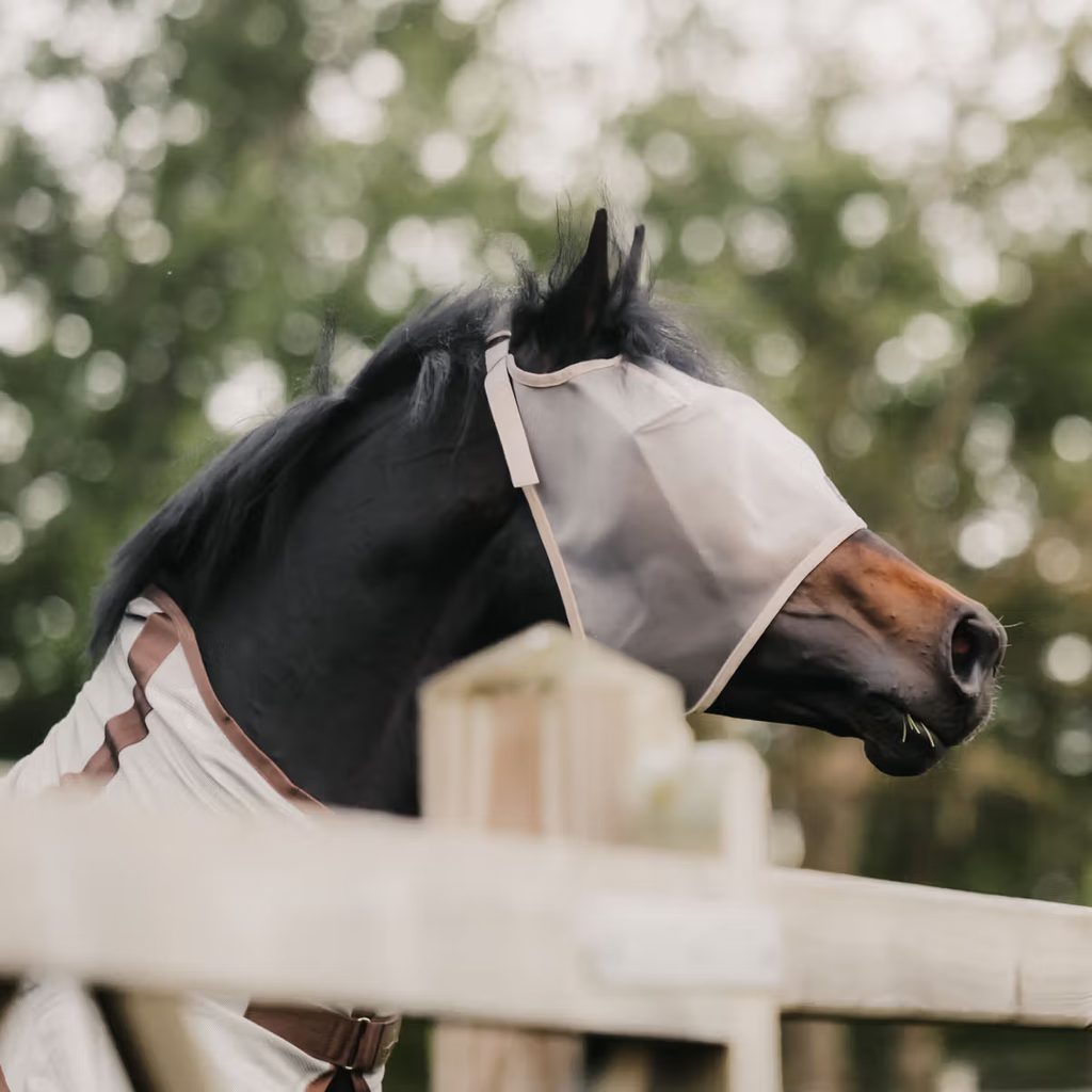 Lehká síťovaná konstrukce zajišťuje výbornou prodyšnost a pohodlí, zatímco jemné měkké okraje minimalizují riziko odřenin. Díky praktickému zapínání maska perfektně drží na hlavě po celý den, což z ní dělá ideální doplněk pro koně ve výběhu.