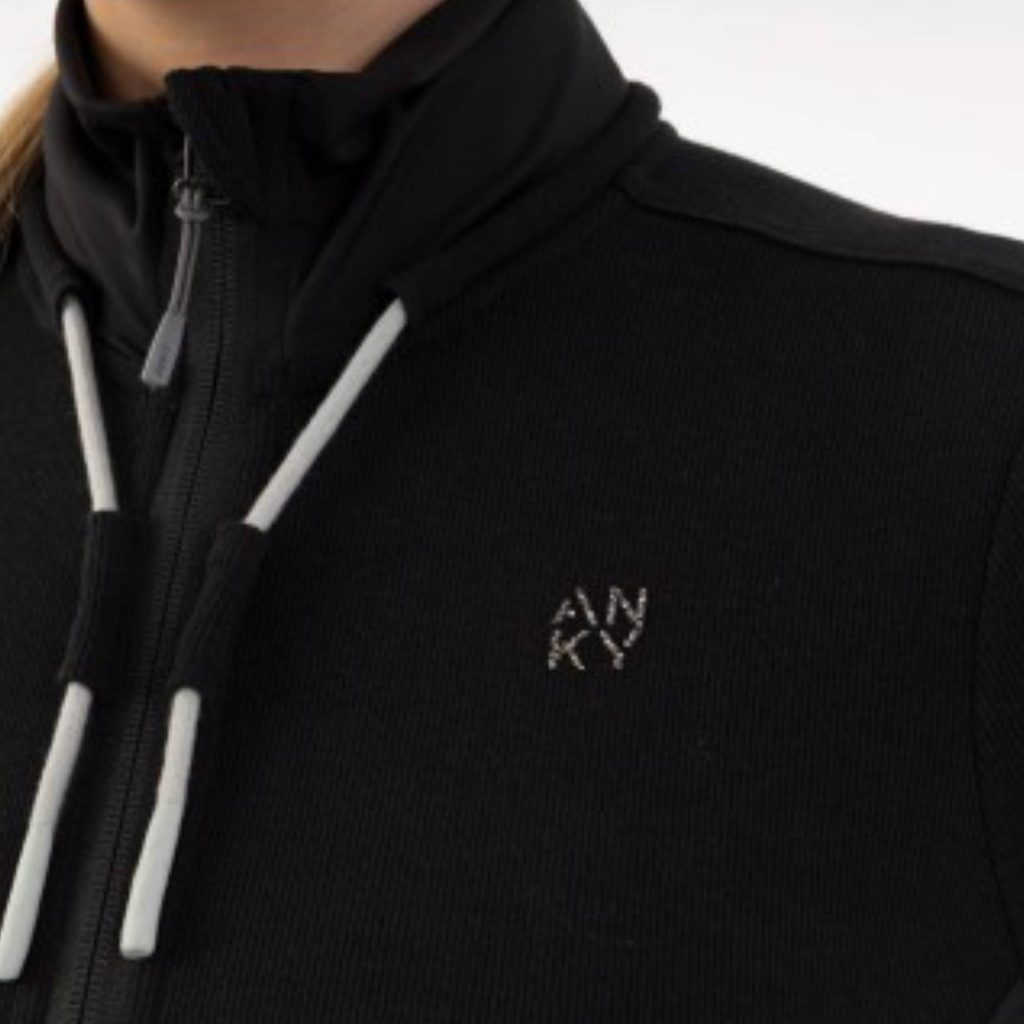 Design doplňují velmi vkusné a ženské detaily. Na levé přední části se nachází logo z lesklých kamínků, které dodává mikině jemný elegantní akcent a podtrhuje prémiový vzhled značky ANKY. Kontrastní šňůrka vedená podél výstřihu v textilním tunýlku působí stylově a dodává modelu sportovně moderní charakter.