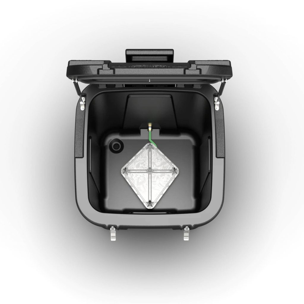 - Další prvky: snadno otevíratelné víko, kolečka a madlo pro manipulaci