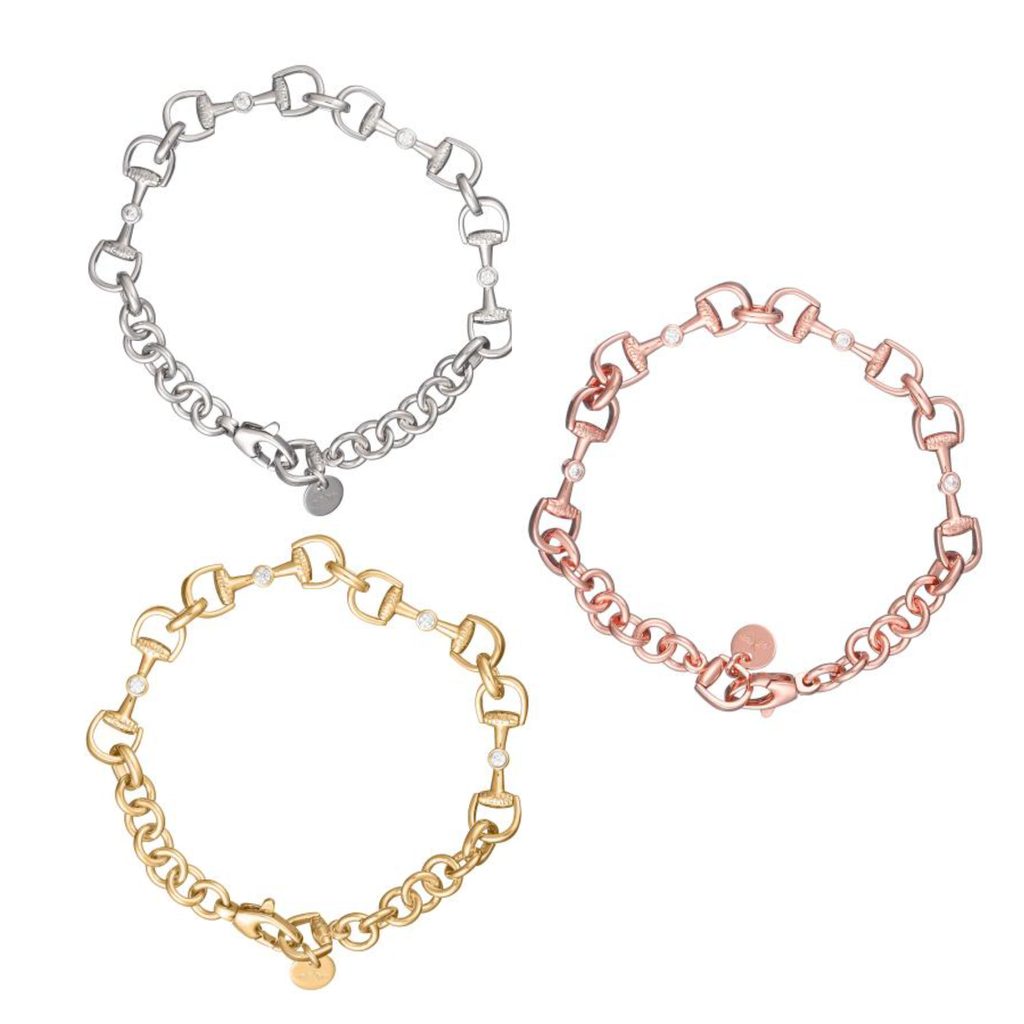 Díky třem různým kovovým odstínům jej snadno sladíte s jakýmkoli outfitem – ať už míříte do stáje, na procházku městem nebo na jezdecké závody. Výrazná ražená mince s logem značky dodává náramku exkluzivní vzhled, zatímco pevné zapínání zajišťuje pohodlí i dlouhou životnost.