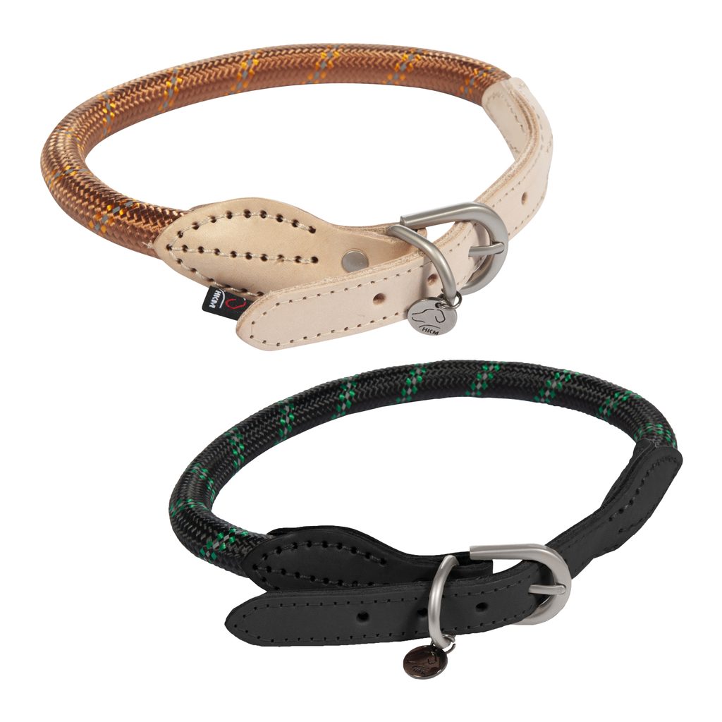 Nylonový obojek s detaily z pravé kůže a reflexními prvky. Velikosti: S/29-35 cm/1,2 cm, M/36-42 cm/1,2 cm, L/43-49 cm, XL/50-56 cm/1,5 cm. Barva: černá a koňak. Cena dle velikosti.