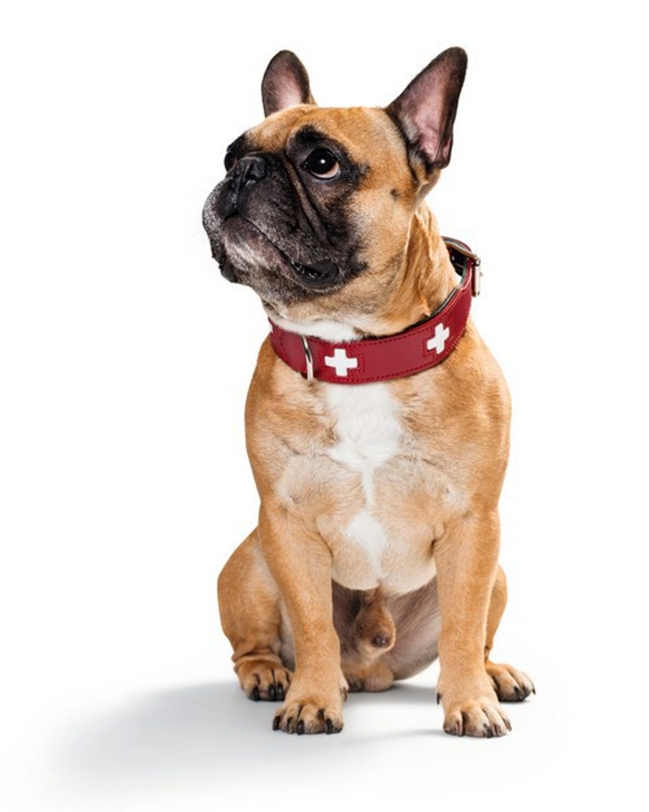 Krásný, pevný a komfortní kožený obojek, červený nebo hnědý s bílými kříži ve stylu švýcarské vlajky. Délky 37, 55, 60, 65, 70 a 75 cm