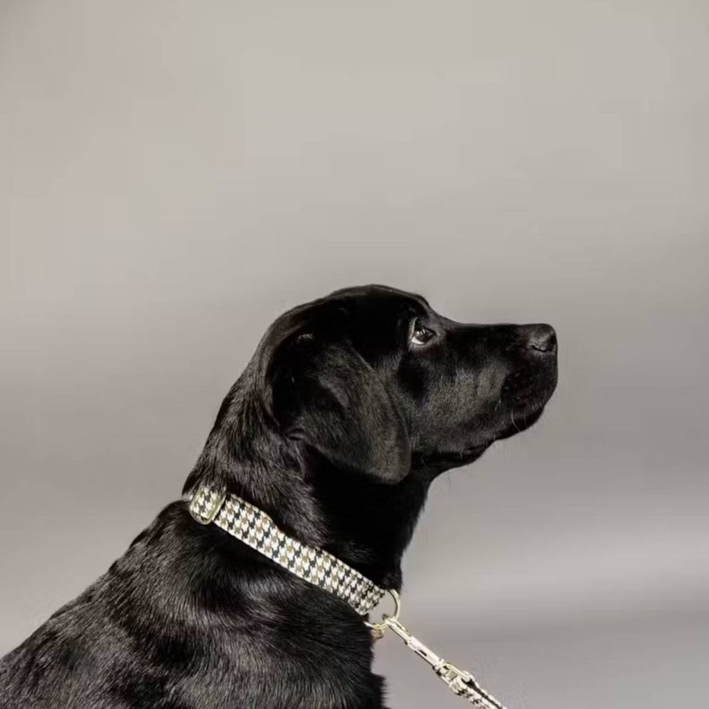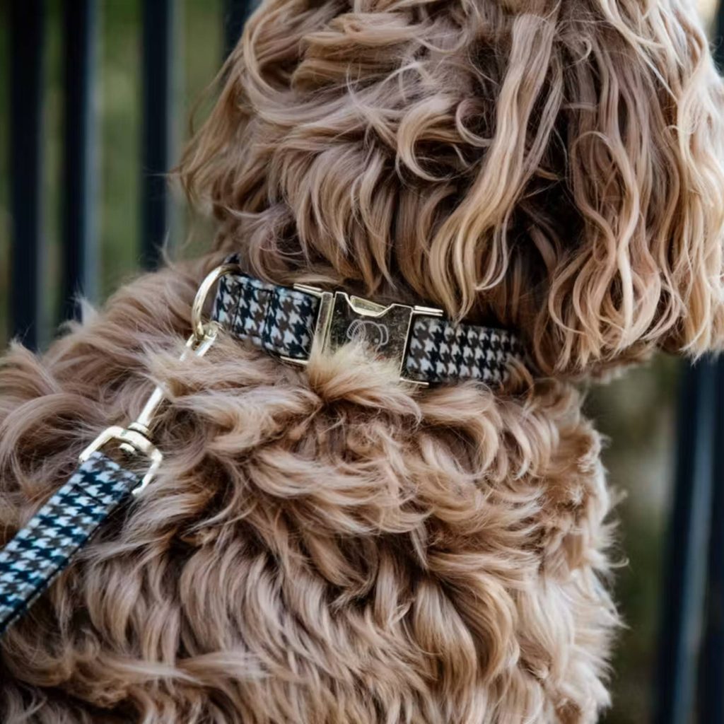 Spojení elegance a praktičnosti! Obojek s nadčasovým vzorem pied-de-poule zaujme na první pohled a skvěle padne každému psovi.