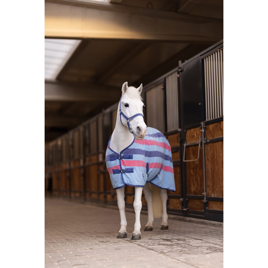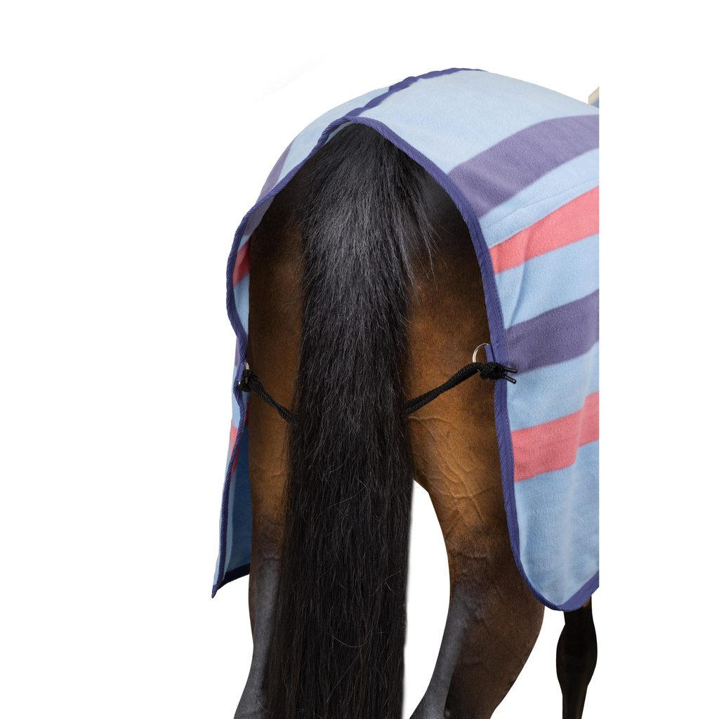 Odpocovací deka v poutavém pruhovaném vzhledu. Fleecová tkanina je z prodyšného a rychleschnoucího polyesteru 250 g/m². Deka má nastavitelné přední zapínání podložené suchým zipem, nastavitelné křížové zapínání pod břichem a podocasní šňůru. Kohoutek je měkce podložen proti odření.