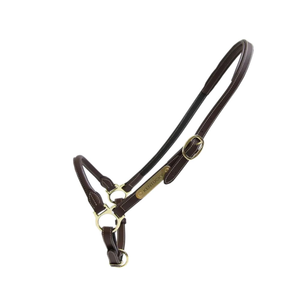 Ohlávka je vyrobená z umělé kůže, která neabsorbuje vodu ani nečistoty, neláme se, neztvrdne a nemění barvu. Je flexibilnější než pravá kůže, a proto je mnohem příjemnější na použití. Ohlávka nemá podhrdelník, a tak se velmi snadno nasazuje a neomezuje při péči o koně. Zdobí ji zlatý štítek s nápisem KENTUCKY, který lze otočit a nechat na něj vygravírovat jméno koně. Ohlávka má kování ve zlaté barvě. Velikost lze přizpůsobit.