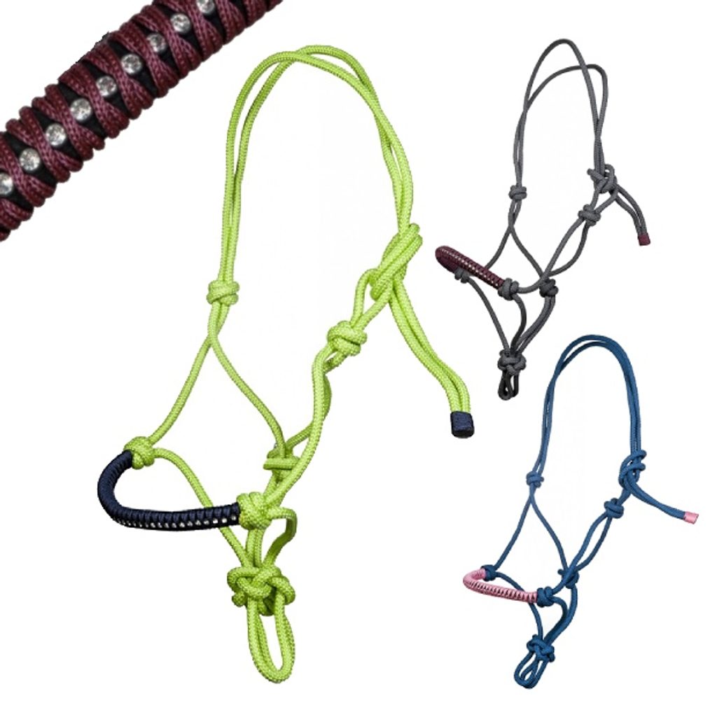 Provazová ohlávka od značky HKM zdobená kamínky. Ohlávka neslouží k uvazování koní na pevno! Velikost: Cob, Full. Barvy: azur/rosa, limeta/tmavě modrá, tmavě šedá/vínová. Materiál: 100% polypropylen.