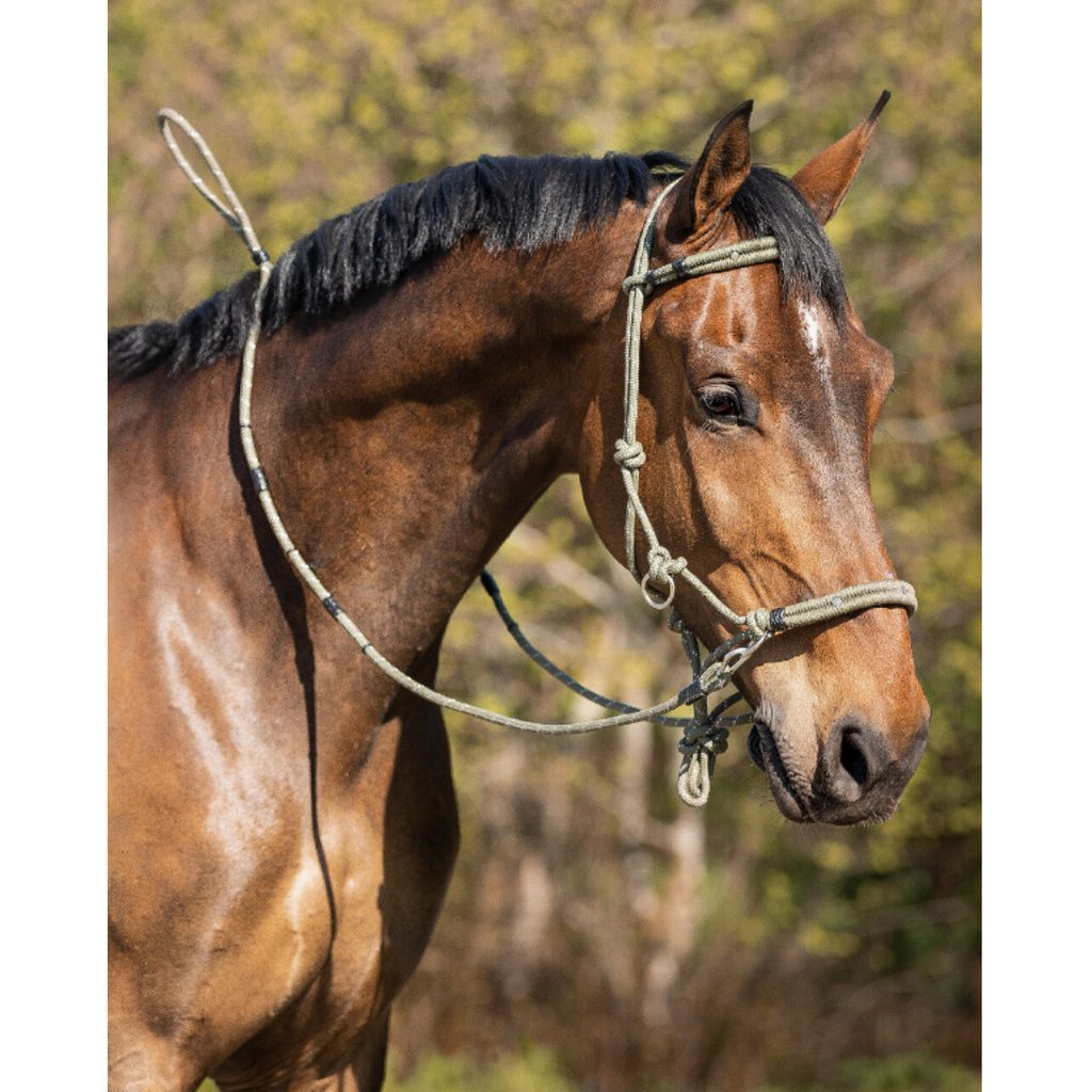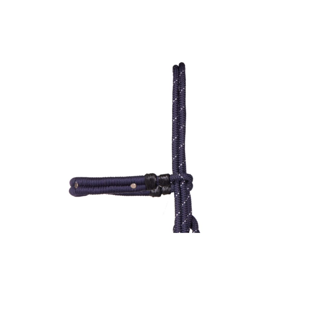 Multifunkční provazová ohlávka s otěžemi. Lze ji použít jako ohlávku nebo uzdečku. Díky koženým očkům lze k ohlávce připevnit i udidlo. Otěže jsou odnímatelné s protiskluzovými zarážkami. Na konci otěží je pohyblivá zarážka, kterou si otěže můžete upravit, aby nebyly příliš dlouhé.